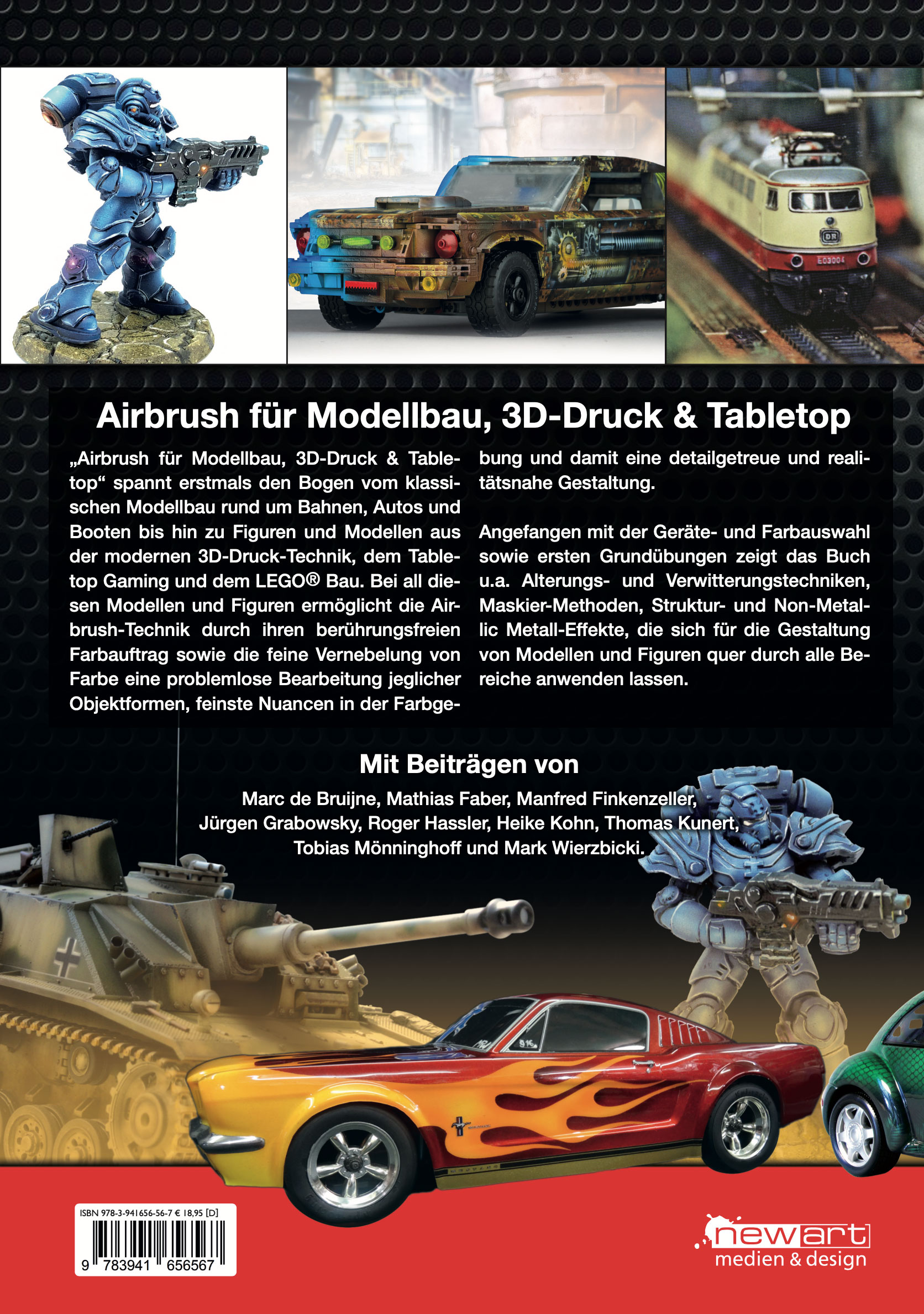 "Airbrush für Modellbau, 3D-Druck & Tabletop" spannt erstmals den Bogen vom klassischen Modellbau rund um Bahnen, Autos und Boote bis hin zu Figuren und Modelle aus der modernen 3D-Druck-Technik, dem Tabletop Gaming und dem LEGO Bau. Bei all diesen Modellen und Figuren ermöglicht die Airbrush-Technik durch ihren berührungsfreien Farbauftrag sowie die feine Vernebelung von Farbe eine problemlose Bearbeitung jeglicher Objektformen, feinste Nuancen in der Farbgebung und damit eine detailgetreue und realitätsnahe Gestaltung.