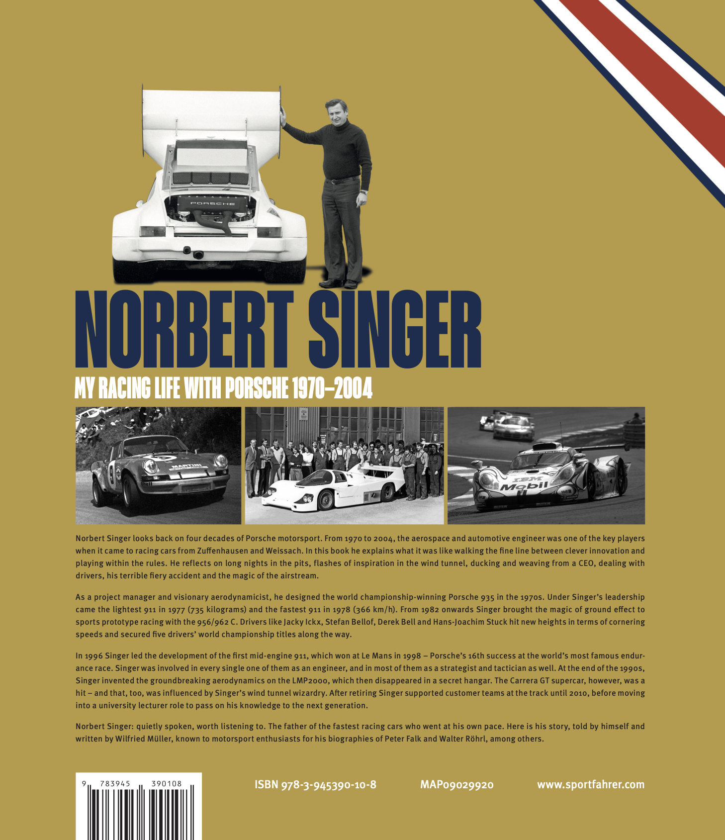 'The gearbox in the 917 needs to survive the 24 Hours of Le Mans without overheating. But the new cooling system can't create any additional drag. Okay, off you go.' That was the first task given to newly-qualified aerospace and automotive engineer Norbert Singer when he joined Porsche's racing development programme in the spring of 1970.As we now know the gearbox was reliable, Porsche won the race, and Norbert Singer stayed loyal to the German carmaker for decades to come. To celebrate Singer's 80th birthday, Sportfahrer Verlag in Düren brings you ##BOOK TITLE##. What started out as a plan to update an older book has, through many conversations between Singer and author Wilfried Müller, grown into a comprehensive and detailed autobiography.Across 16 chapters and more than 350 pages Singer describes the greatest era of Porsche racing to date from his own unique perspective, that of a visionary race engineer and aerodynamicist, and cunning tactician and interpreter of rules. From the 917 to the 911 Carrera RSR, to the world championship-winning 935, to the lightest (735 kilograms) and fastest (366 km/h) 911 in history. Singer also details the background of the three-time Le Mans-winning Porsche 936.Like the Carrera Turbo RSR and the 935, Singer was the project manager for the ground-breaking Porsche 956. The car wrote Porsche into the motor racing history books. Singer successfully took the "ground effect" aerodynamic concept used in Formula 1 and applied it to two-seater sportscars. At the time it was pinnacle of Singer's passionate search for downforce. Drivers like Jacky Ickx, Stefan Bellof, Derek Bell, Jochen Mass and Hans-Joachim Stuck achieved unthinkable cornering speeds in these 800-horsepower cars, collecting five world championships along the way.In the mid-1980s Porsche ventured into unknown - and, as it turned out, very difficult - territory with its single-seater programme in the American CART series. Singer details the tumultuous saga from the inside. A more enjoyable recollection is the artful transformation of a racing prototype into a Gran Turismo car, the Porsche 962 LM GT1, which conquered Le Mans in 1994. Continuing the GT1 theme, Singer led the development of the first mid-engine 911 in 1996, one of those cars then winning at Le Mans in 1998. It was the 16th triumph for Porsche at the world's most famous endurance race. Singer was involved in all of them as an engineer, and most of them as a tactician and strategist on the pit wall. His detailed recollections of those 24-hour marathons make up much of the book, from his escape from the CEO, to an improvised air lift for parts.At the end of the 1990s the man with the reading glasses always sitting low on his nose designed the groundbreaking aerodynamics on the LMP2000 Spyder - only for the car to be resigned to secrecy in a hangar. The famous Carrera GT super sports car also had Singer's touch in the wind tunnel. As Porsche boss Wendelin Wiedeking said at the time, "Singer will come up with something". After retiring Singer continued to support customer teams at race tracks until 2010, before passing his knowledge onto the next generation of engineers with a stint as a university lecturer.Forty years of racing with Porsche, as told by Norbert Singer and written by Wilfried Müller, who is known to motorsport enthusiasts for his Peter Falk and Walter Röhrl biographies.This book is the first work by the publisher done in cooperation with the Porsche Museum. The "Edition Porsche Museum" has its own Porsche part number (MAP09029920) and can obtained through the manufacturer's distribution channels, including any Porsche dealer or the museum store.