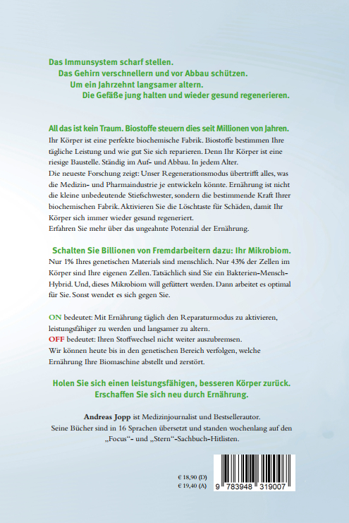 Biostoffe haben Andockstellen im Körper, die sich über Millionen Jahre entwickelt haben. Diese ON/OFF-Schalter sind das ungeahnte Potenzial der Ernährung. Der Medizinjournalist und Autor Andreas Jopp zeigt verständlich und spannend, welche Biostoffe ON-Schalter umlegen können und welche OFF-Schalter Ihre Biomaschine herunterfahren, Sie genetisch schneller altern lassen und die Reparatursysteme blockieren. Er bezeichnet sich selbst als "ungläubig" und will immer zuerst Studien sehen. Möchte für sich und seine Leser wissen, was sich wirklich lohnt. Was bewiesen ist. Und wie man es für sich leicht umsetzen kann. Dieses Buch wird Ihren Blick auf Ihren Mikrokosmos Körper für immer verändern.