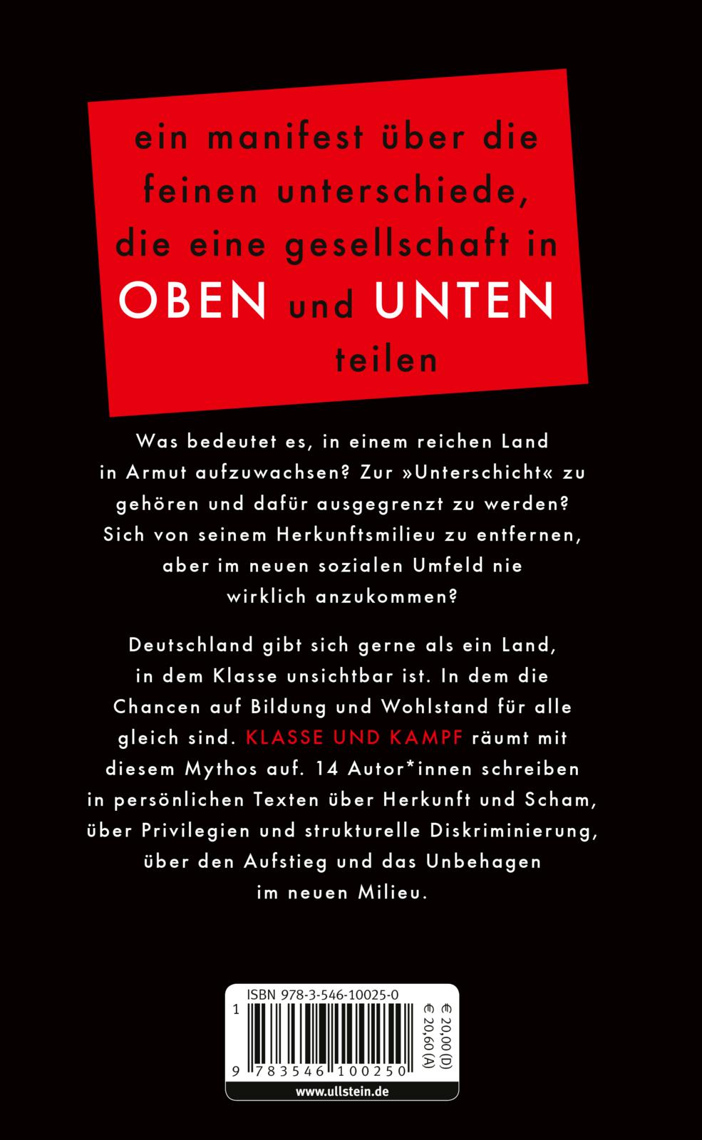 Deutschland gibt sich gerne als ein Land, in dem Klasse unsichtbar ist. In dem die Chancen auf Bildung und Wohlstand für alle gleich sind. Klasse und Kampf räumt mit diesem Mythos auf. 14 Autor*innen schreiben in persönlichen Essays über Herkunft und Scham, über Privilegien und strukturelle Diskriminierung, über den Aufstieg und das Unwohlsein im neuen Milieu. Zusammen ergeben ihre Stimmen ein vielschichtiges Manifest von großer politischer Kraft.