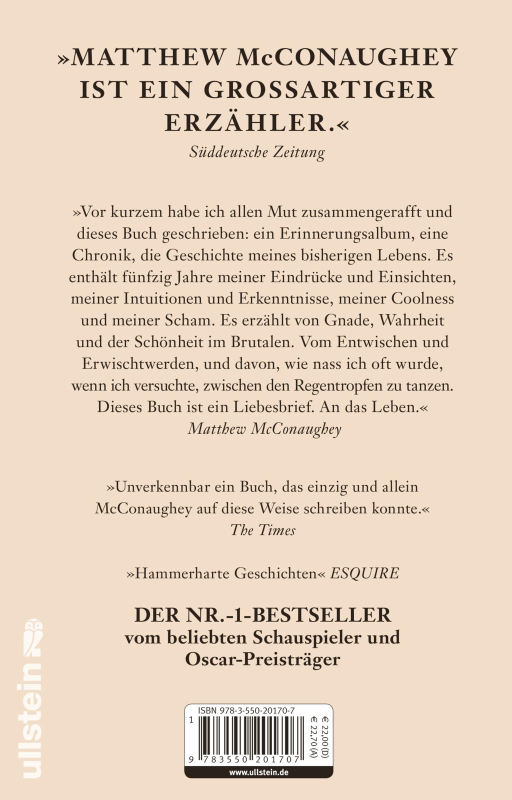 "Der Texaner erweist sich als fabulierfreudiger Erzähler. Die knapp dreihundert Seiten lesen sich leicht, wirken wie aus einem Guss. Dabei sind sie genau das gar nicht. In den Text sind nämlich immer wieder Fotos, zum Beispiel vom kindlichen und vom jugendlichen Matthew und über die Jahre gesammelte Notizzettel einmontiert. Und gerade da, in den kurzen Gedankensplittern auf den "Zetteln", offenbart sich Wesentliches:Matthew McConaughey zeichnet eine sympathische Selbstironie aus. Er nimmt sich ernst, aber nicht zu wichtig. Beim Lesen hat man oft das Gefühl, den Erzählungen eines guten Kumpels zu lauschen."