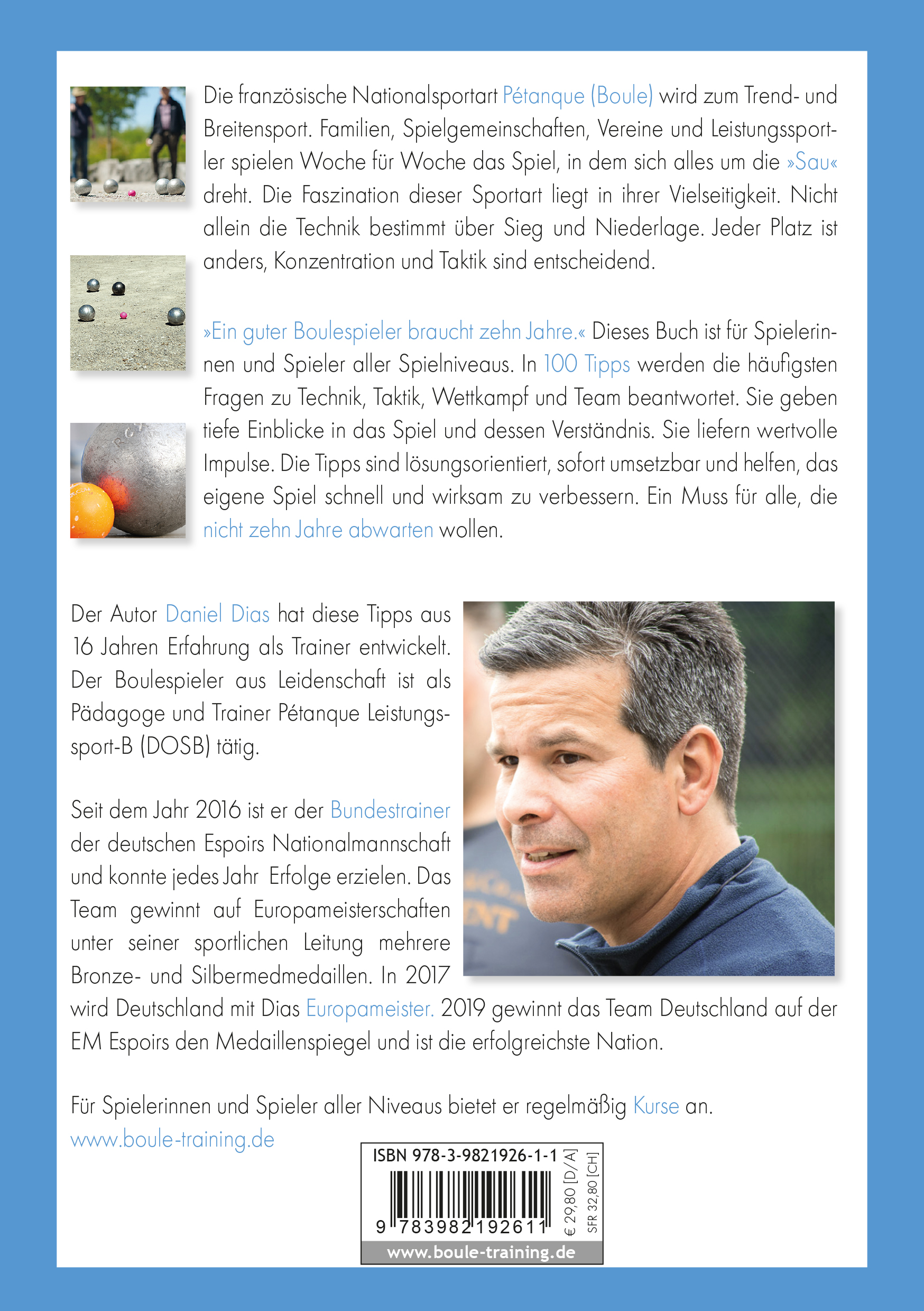 Standardwerk für alle Boule-Spieler*innen, die das Spiel »richtig« kennenlernen und spielen möchten. 100 Tipps beantworten die Häufigsten Fragen von Trainierenden. Fast alle Tipps verbessern das Spiel sofort, ohne Training. Jeder kann die meisten Tipps sofort anwenden und sich dadurch verbessern.Themenbereiche: Tipps rund um Kugeln, Tipps rund ums Zubehör, Tipps rund ums Terrain, Tipps zur Bewegung und Haltung, Tipps rund ums Legen, Tipps rund ums Schießen, Tipps zur Taktik, Tipps für den Wettkampf, Tipps rund um den Kopf, Tipps rund um das TeamGlossar und Hintergrundinformationen