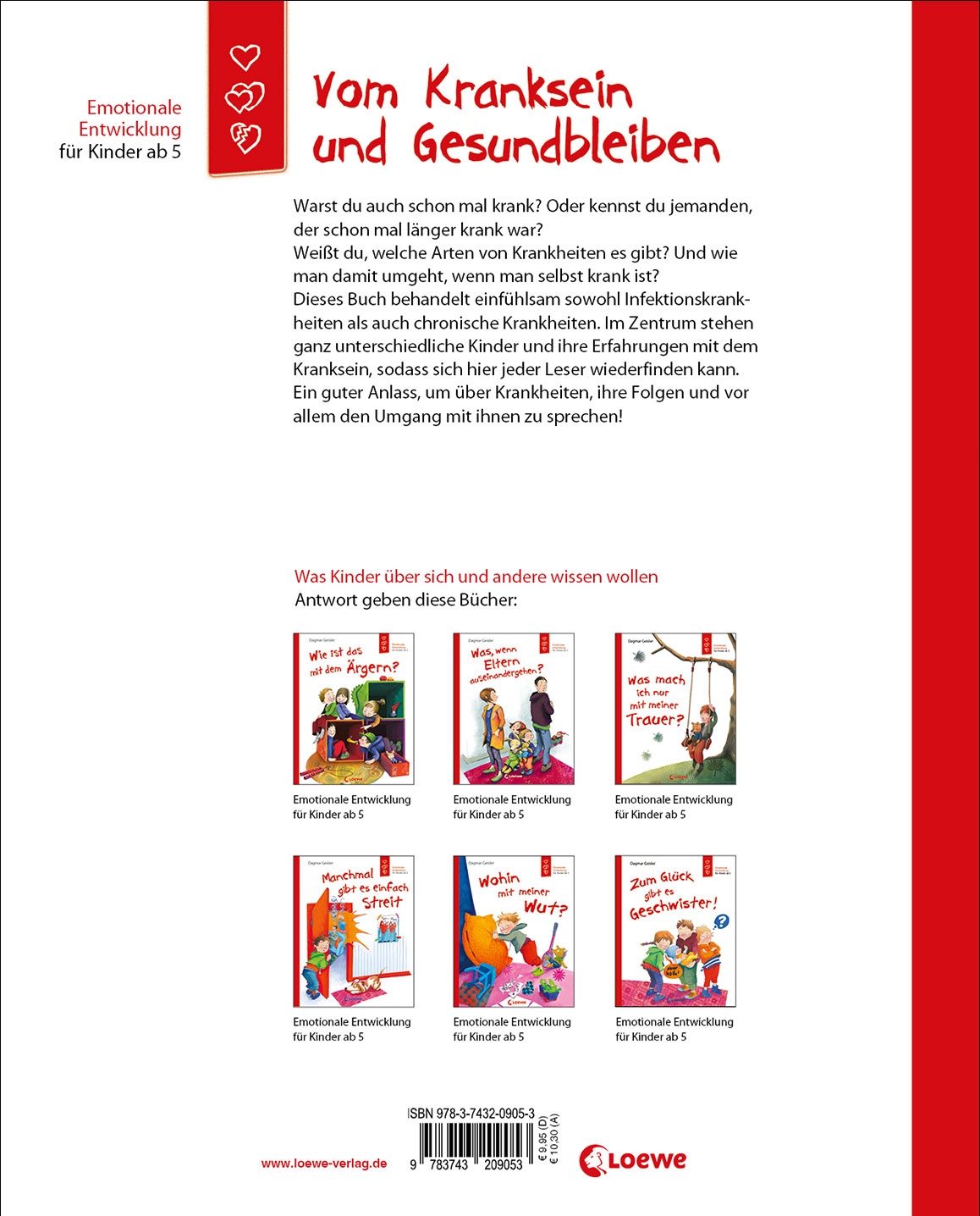 Das neue Bilderbuch zur emotionalen Entwicklung von Kindern von Dagmar Geisler nähert sich einfühlsam dem Thema Kranksein an und zeigt Kindern ab 5 Jahren anschaulich, wie Krankheiten entstehen und wie man damit umgeht, wenn man selbst krank ist oder andere es sind. Dieses Buch will Gesprächsanlässe bieten und Kindern in schwierigen emotionalen Situationen Halt geben sowie Lösungsansätze aufzeigen.
