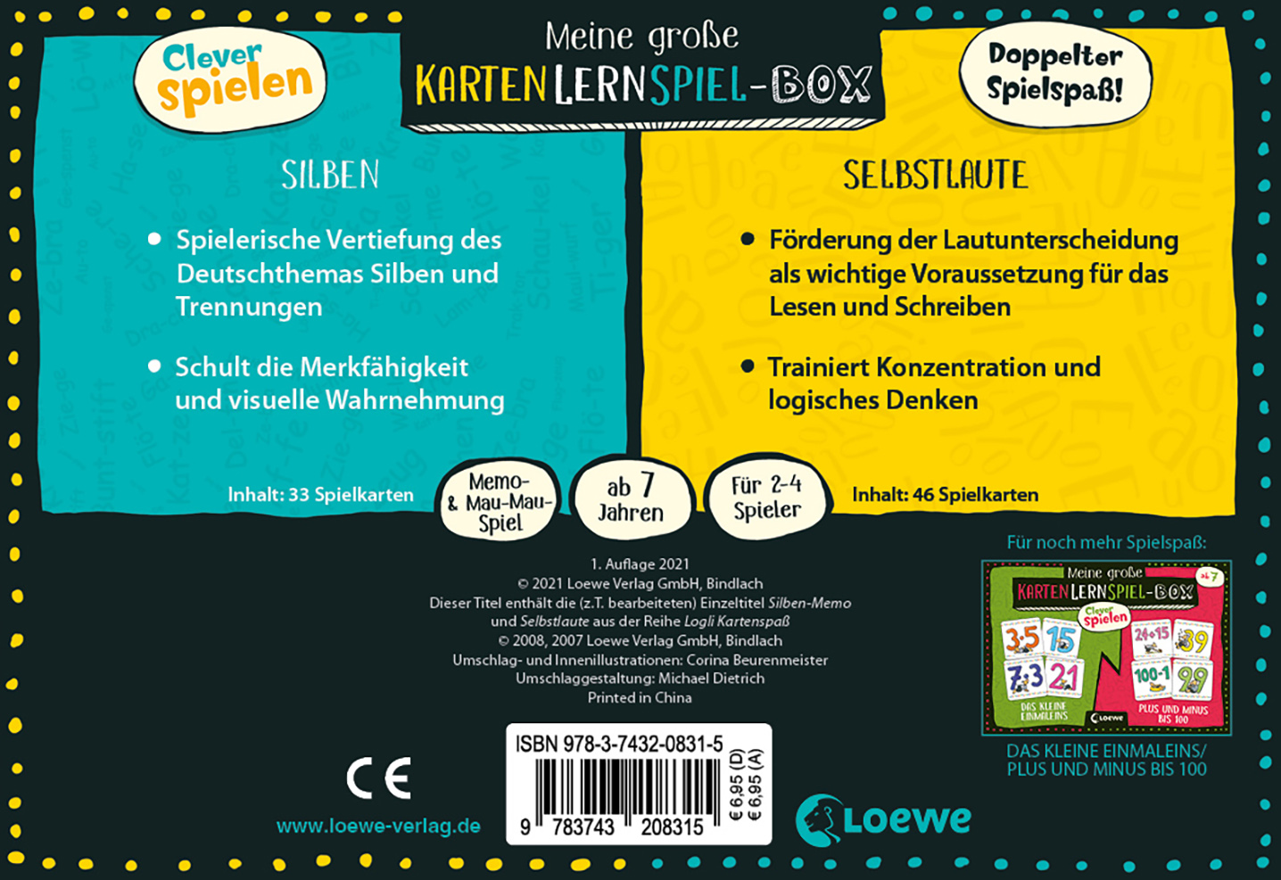 Unsere Doppelboxen enthalten gleich zwei Kartenspielsets, die Spielen und Lernen miteinander verbinden. Die Spiele überzeugen durch eine frische Optik und bewährte Spielprinzipien - und bringen Kindern ab 7 die Themen Silben und Selbstlaute spielerisch näher. Ob Memo oder Mau-Mau: Die Spiele sind nicht nur unterhaltsam, sondern helfen auch beim Erlernen und Festigen der verschiedenen Themen und Kernkompetenzen in der Schule.