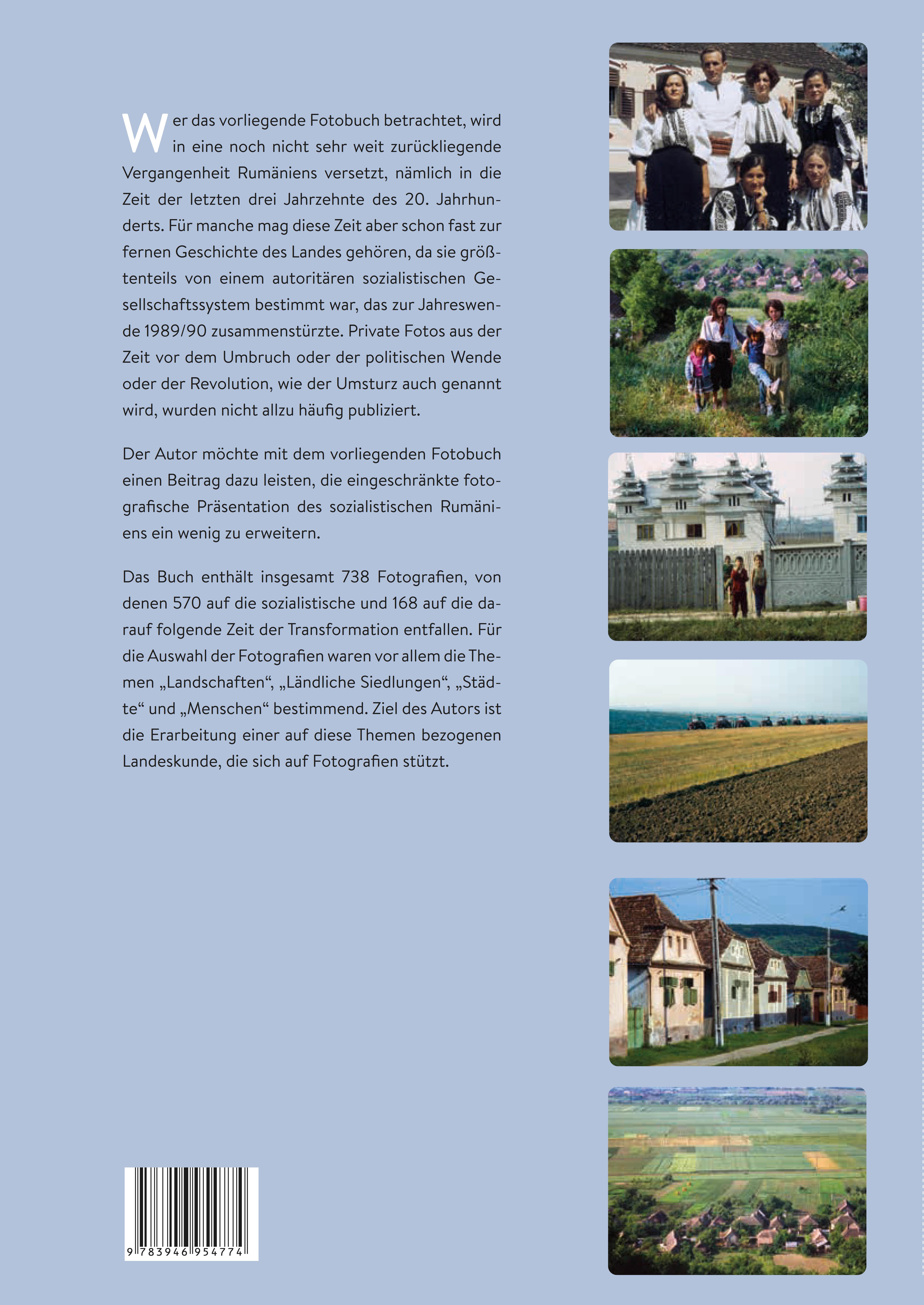 Wer das vorliegende Fotobuch betrachtet, wird in eine noch nicht sehr weit zurückliegende Vergangenheit Rumäniens versetzt, nämlich in die Zeit der letzten drei Jahrzehnte des 20. Jahrhunderts. Für manche mag diese Zeit aber schon fast zur fernen Geschichte des Landes gehören, da sie größtenteils von einem autoritären sozialistischen Gesellschaftssystem bestimmt war, das zur Jahreswende 1989/90 zusammenstürzte. Private Fotos aus der Zeit vor dem Umbruch oder der politischen Wende oder der Revolution, wie der Umsturz auch genannt wird, wurden nicht allzu häufig publiziert. Der Autor möchte mit dem vorliegenden Fotobuch einen Beitrag dazu leisten, die eingeschränkte fotografische Präsentation des sozialistischen Rumäniens ein wenig zu erweitern. Das Buch enthält insgesamt 738 Fotografien, von denen 570 auf die sozialistische und 168 auf die darauf folgende Zeit der Transformation entfallen. Für die Auswahl der Fotografien waren vor allem die Themen "Landschaften", "Ländliche Siedlungen", "Städte" und "Menschen" bestimmend. Ziel des Autors ist die Erarbeitung einer auf diese Themen bezogenen Landeskunde, die sich auf Fotografien stützt.