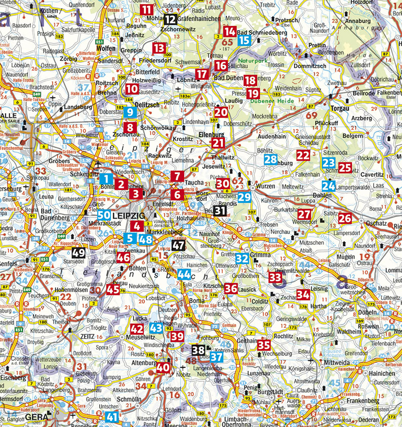 Leipzig ist eine grüne Stadt und schöne Wanderungen lassen sich bereits im Stadtgebiet unternehmen. Im Leipziger Neuseenland locken große und kleine Gewässer, in der Dübener Heide reizvolle Wälder. Schlösser, Burgen und steile Felsen begeistern vor allem im Muldetal. Unbekanntere Kleinode sind die ausgedehnten Wälder der Dahlener Heide und das hügelige Kohrener Land. Es lohnt, sie zu erkunden! Das Altenburger Land punktet mit lieblicher Hügellandschaft, Bauerndörfern und Burgen - und natürlich mit der Skatstadt Altenburg und ihrem imposanten Schloss.