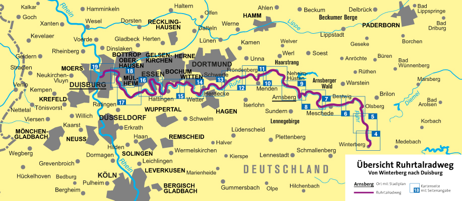 - Der Ruhrtalradweg folgt dem Fluss von der Quelle bei Winterberg im Sauerland bis zur Mündung in den Rhein in Duisburg - auf insgesamt 241 Kilometern. Und bietet ein herrliches Kontrastprogramm. Wiesen, Fachwerkorte und Auenlandschaften liegen im Sauerland am Ruhrtalradweg. Treidelpfade, Technikdenkmäler, Burgen und Altstädte in der Metropole Ruhr, Europas Kulturhauptstadt des Jahres 2010.