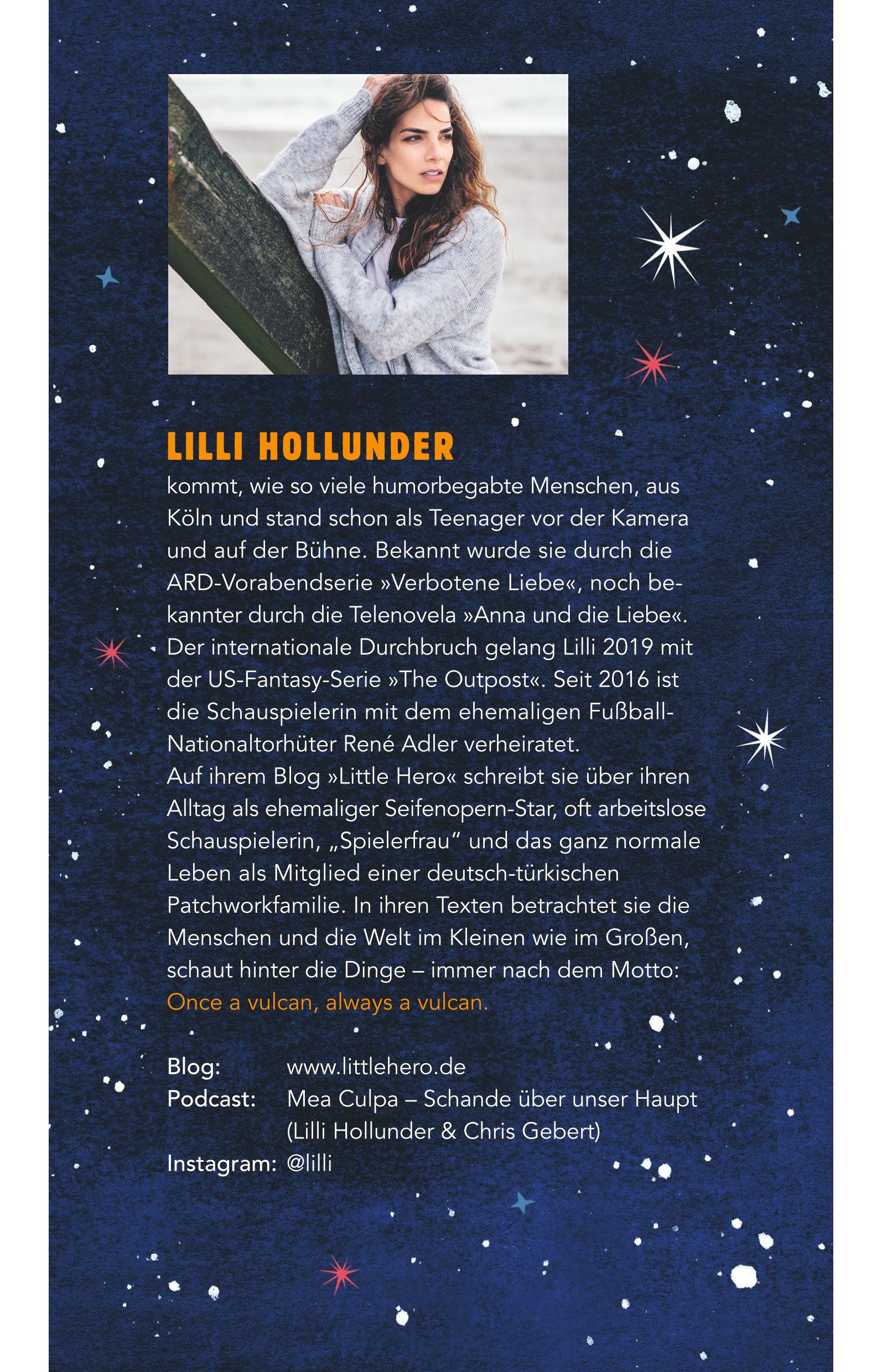 Lilli Hollunder ist Schauspielerin und bekannt durch die Serie „Verbotene Liebe“, der internationale Durchbruch gelang ihr mit der US-Fantasy-Serie "The Outposter". Auf dem Blog „Little Hero“ schreibt sie über ihr Leben als oft arbeitslose Schauspielerin und "Spielerfrau" an der Seite des Ex-Nationaltorhüters René Adler. Neben dem Schreiben redet sie gerne – am liebsten mit Kollegen Chris Gebert im Podcast „Mea culpa – Schande über unser Haupt“.