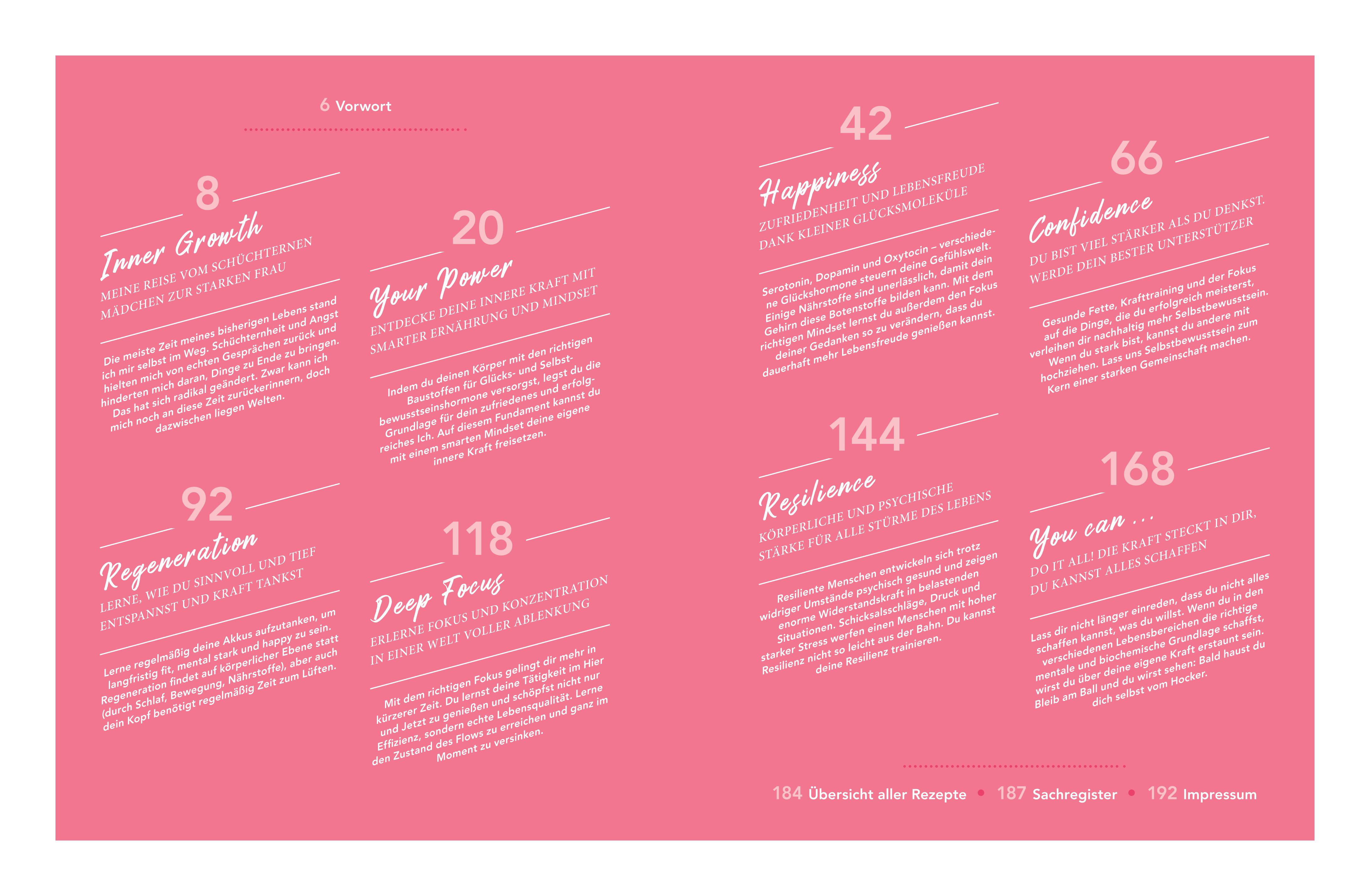 Hinweis zur OptimierungImpressumBackofenhinweisVorwortInner Growth - meine Reise vom schüchternen Mädchen zur starken FrauYour Power - entdecke deine innere Kraft mit smarter Ernährung und MindsetHappiness - Zufriedenheit und Lebensfreude dank kleiner GlücksmoleküleConfidence - du bist viel stärker als du denkst. Werde dein bester UnterstützerRegeneration - lerne, wie du sinnvoll und tief entspannst und Kraft tankstDeep Focus - Erlerne Fokus und Konzentration in einer Welt voller AblenkungResilience - körperliche und psychische Stärke für alle Stürme des LebensYou can ... - do it all! Die Kraft steckt in dir, du kannst alles schaffenMein eigenes DankbarkeitsjournalDie AutorinDie FotografinDie Illustratorin