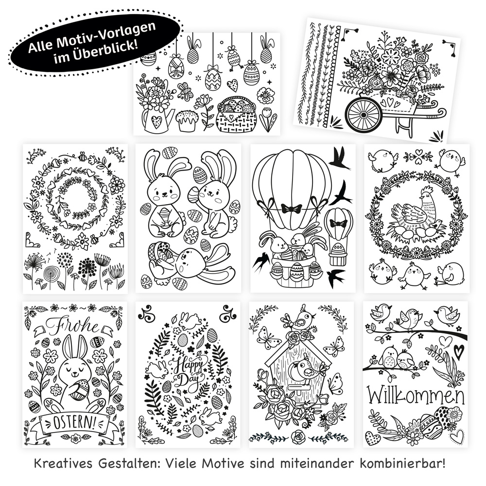 Wunderschöne Fensterdeko für viele Anlässe zum Selbstgestalten!Die Motive werden mit dem Kreidestift ganz einfach auf die Fensterscheibe übertragen.Der Stift ist rückstandslos entfernbar.Für Fenster, Vitrinen und alle anderen glatten Glasflächen!