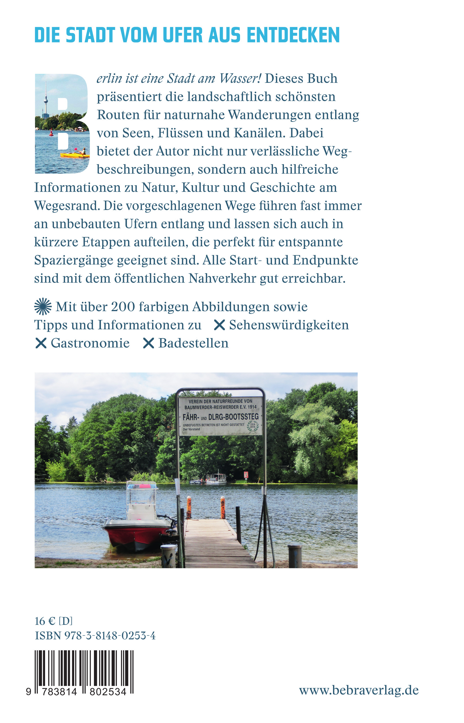 Berlin ist eine Stadt am Wasser! Dieses Buch präsentiert die landschaftlich schönsten Routen für naturnahe Wanderungen entlang von Seen, Flüssen und Kanälen. Dabei bietet der Autor nicht nur verlässliche Weg-beschreibungen, sondern auch hilfreiche Informationen zu Natur, Kultur und Geschichte am Wegesrand. Die vorgeschlagenen Wege führen fast immer an unbebauten Ufern entlang und lassen sich auch in kürzere Etappen aufteilen, die perfekt für entspannte Spaziergänge geeignet sind. Alle Start- und Endpunkte sind mit dem öffentlichen Nahverkehr gut erreichbar.Mit über 200 farbigen Abbildungen sowie Tipps und Informationen zu Sehenswürdigkeiten, Gastronomie und Badestellen.