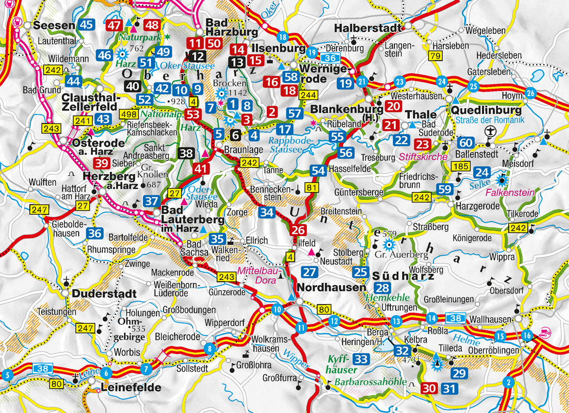 - Hauptlandschaften sind der mit der Brockenbahn erreichbare Hochharz, der Westharz bei der Kaiser- und Weltkulturerbestadt Goslar, der Unterharz nahe der Weltkulturerbestadt Quedlinburg und die weißen Gipslandschaften in der "Karstlandschaft Südharz" mit der Barbarossahöhle.