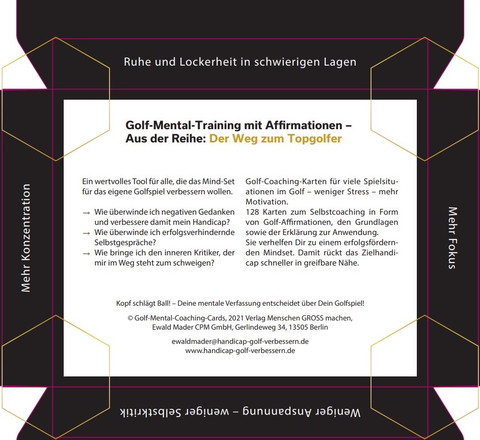 | Schlagworte | Golf • Golfhypnose • Golfsport • Golftraining • Mentalgolf • Mentalwissen • Psychologie |