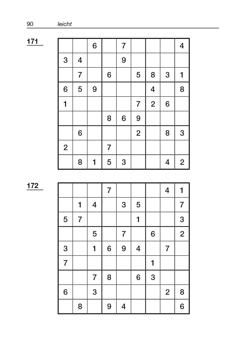 Das aus Japan kommende Rätsel Sudoku besteht aus neun quadratischen 3 x 3-Blöcken, wobei jeder quadratische Block in drei Reihen mit jeweils drei Kästchen unterteilt ist. In jedem quadratischen 3 x 3-Block sind Zahlen zwischen 1 und 9 vorgegeben. Diese vorgegebenen Zahlen gilt es so zu ergänzen, dass jede Zahl zwischen 1 und 9 nur einmal vorkommt. Auch in den neun Spalten und neun Zeilen des gesamten Sudoku Rätsels dürfen die Zahlen von 1 bis 9 nur einmal vor kommen. Die Sudoku-Rätsel sind in die Schwierigkeitsstufen leicht, mittel und schwer und sehr schwer eingeteilt. Jeweils auf der Rückseite finden sich die Lösung zum vorhergehenden Rätsel - für jede Menge Rätselspaß.