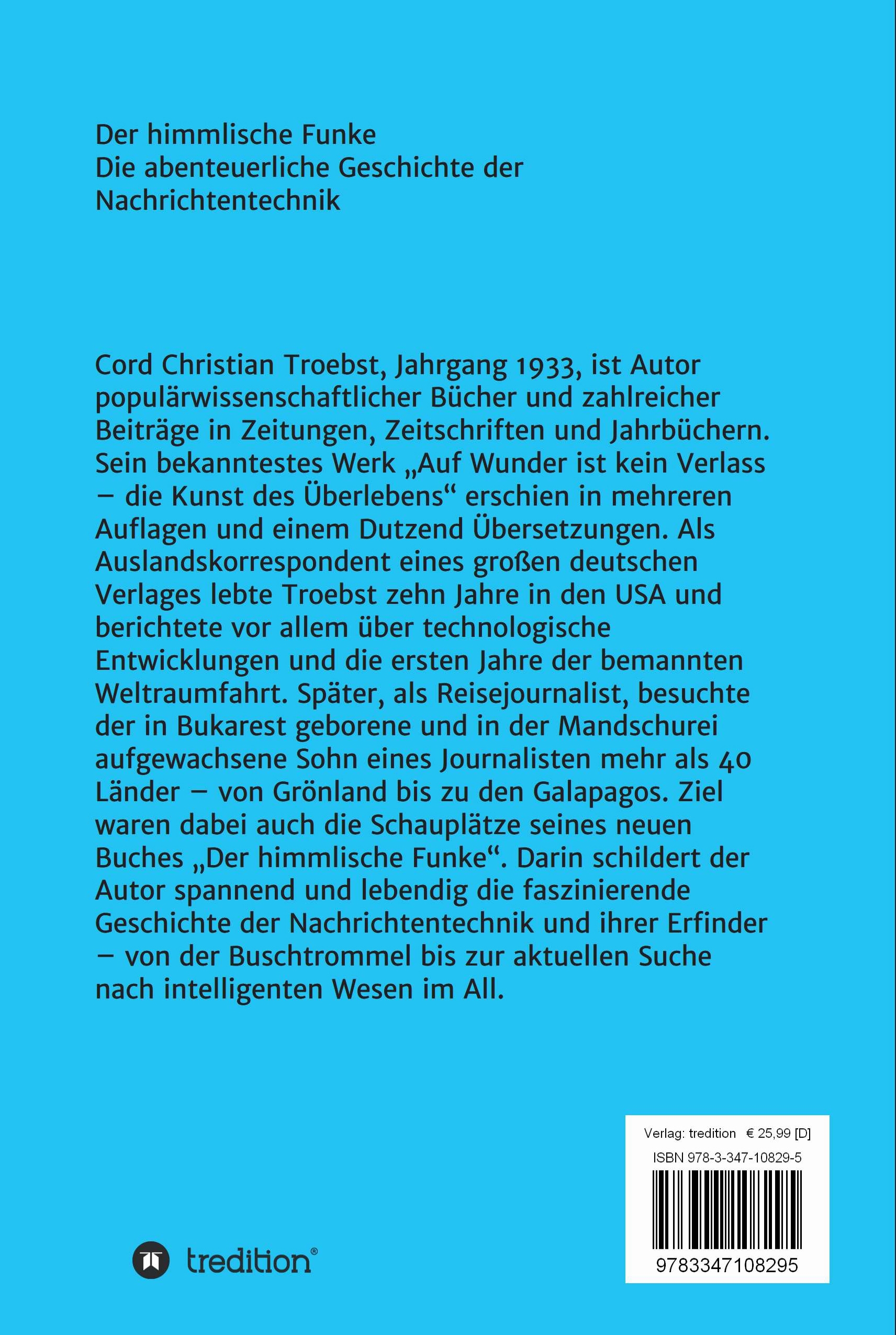 Cord Christian Troebst, Jahrgang 1933, ist Autor populärwissenschaftlicher Bücher und zahlreicher Beiträge in Zeitungen, Zeitschriften und Jahrbüchern. Sein bekanntestes Werk „Auf Wunder ist kein Verlass – die Kunst des Überlebens“ erschien in mehreren Auflagen und einem Dutzend Übersetzungen. Als Auslandskorrespondent eines großen deutschen Verlages lebte Troebst zehn Jahre in den USA und berichtete vor allem über technologische Entwicklungen und die ersten Jahre der bemannten Weltraumfahrt. Später, als Reisejournalist, besuchte der in Bukarest geborene und in der Mandschurei aufgewachsene Sohn eines Journalisten mehr als 40 Länder – von Grönland bis zu den Galapagosinseln. Ziel waren dabei auch die Schauplätze seines neuen Buches „Der himmlische Funke“. Darin schildert der Autor spannend und lebendig die faszinierende Geschichte der Nachrichtentechnik und ihrer Erfinder – von der Buschtrommel bis zur aktuellen Suche nach intelligenten Wesen im All.