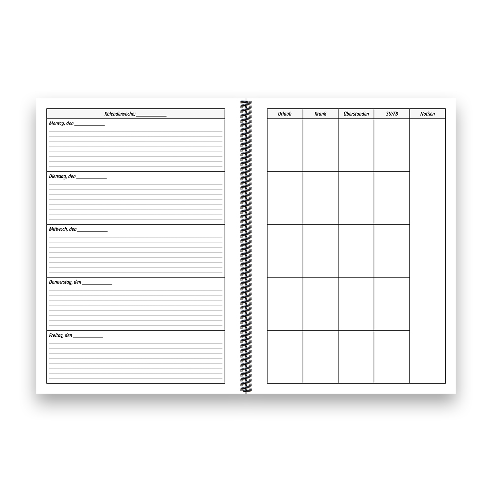 Jede Kalenderwoche ist auf einer Doppelseite dargestellt (inkl. Mitarbeiterübersicht, Notizen und Besprechungen)