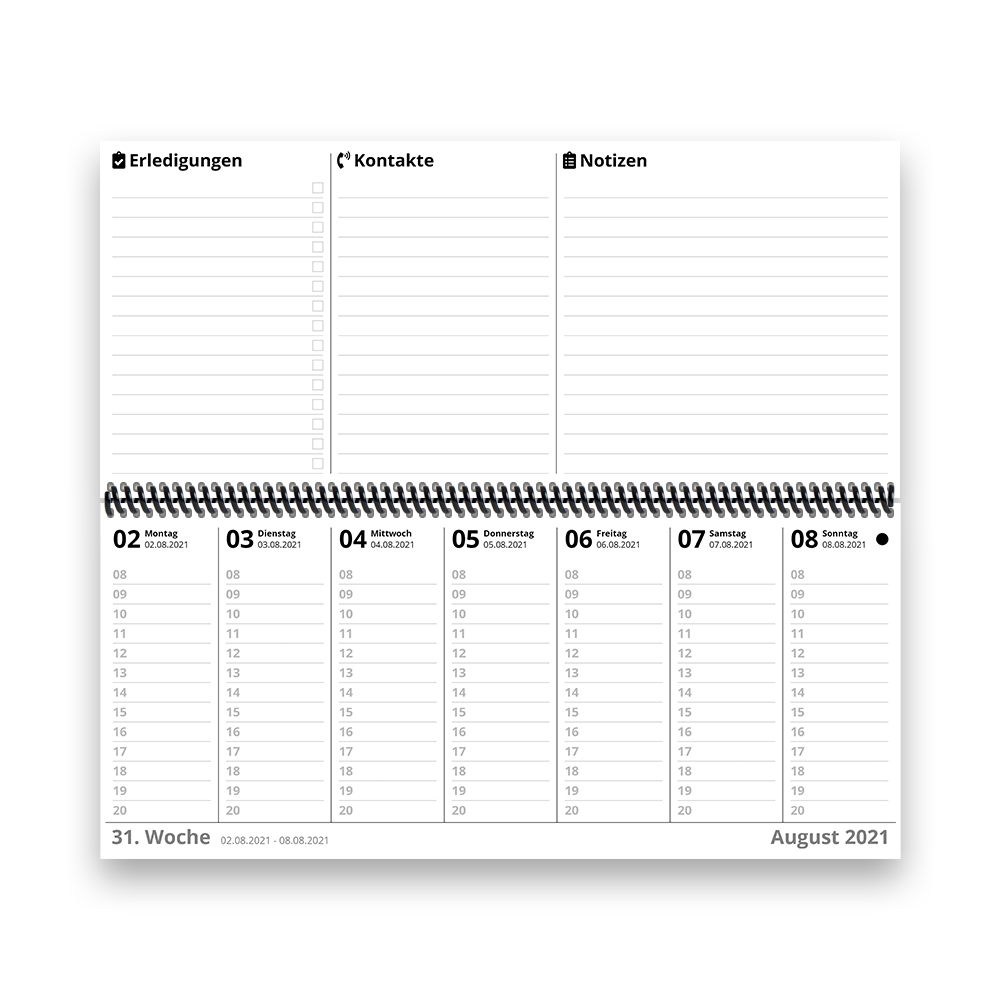 Tisch-Kalender XL im Querformat- extra großes Format 14,5 x 32,5 cm- 1 Woche auf 2 Seiten- 60 Wochen (Juli 2021 - September 2022)- Wochenplaner im Querformat- Stundenaufteilungen von 08:00 - 20:00 Uhr- Erledigungen- Kontakte- Notizen- Schulferien bundesweit- interkulturelle Feiertage (christliche, islamische, jüdische und hinduistische)- Jahresübersicht- Adress-, Telefon- und E-Mail-Verzeichnis