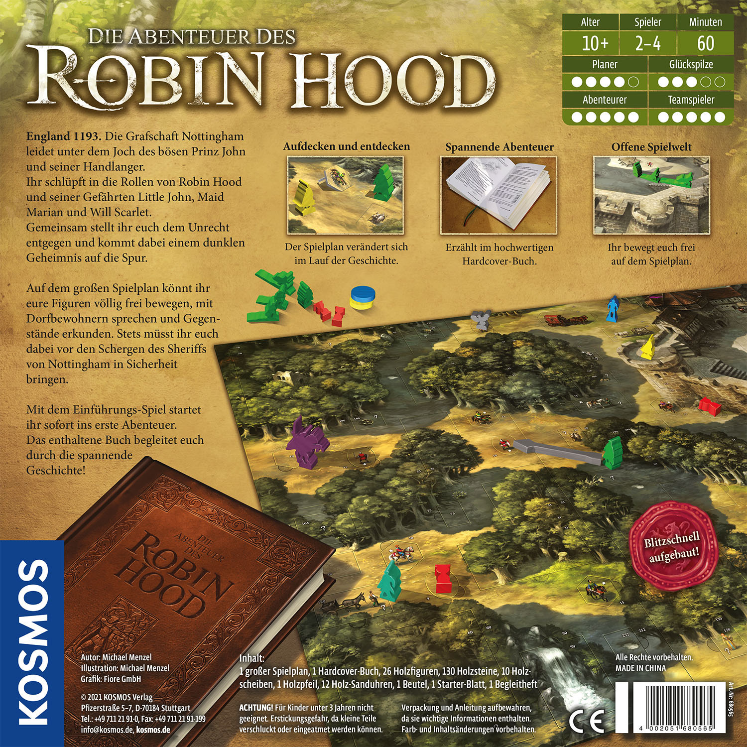 Nominiert zum Spiel des Jahres 2021! Kooperatives Abenteuer-Spiel für die ganze Familie. Ihr spielt gemeinsam gegen das Spiel. Offene Spielwelt: Die Spieler bewegen sich mit einem besonderen Bewegungsmechanismus frei auf dem Spielplan. Lebendiger Spielplan: Der Spielplan verändert sich im Lauf der Geschichte. Spannendes Abenteuer erzählt in einem hochwertigen Hardcover Buch. Schneller Einstieg: Aufbauen und sofort losspielen. Kooperatives Brettspiel vom erfolgreichen "Die Legenden von Andor"-Autor Michael Menzel. Familienspiel für 2-4 Spieler ab 10 Jahren. Nominiert zum Spiel des Jahres 2021! England 1193. Die Grafschaft Nottingham leidet unter dem Joch des bösen Prinz John und seiner Handlanger. Ihr schlüpft in die Rollen von Robin Hood und seiner Gefährten Little John, Maid Marian und Will Scarlet. Gemeinsam stellt ihr euch in diesem Spiel dem Unrecht entgegen und kommt dabei einem dunklen Geheimnis auf die Spur. Auf dem großen Spielplan könnt ihr eure Figuren völlig frei bewegen, mit Dorfbewohnern sprechen und Gegenstände erkunden. Stets müsst ihr euch dabei vor den Schergen des Sheriffs von Nottingham in Sicherheit bringen. Aufbauen und losspielen ihr startet sofort ins erste Abenteuer. Das im Brettspiel enthaltene Buch begleitet euch durch die spannende Geschichte. Ein tolles Geschenk nicht nur für Robin-Hood-Fans!
