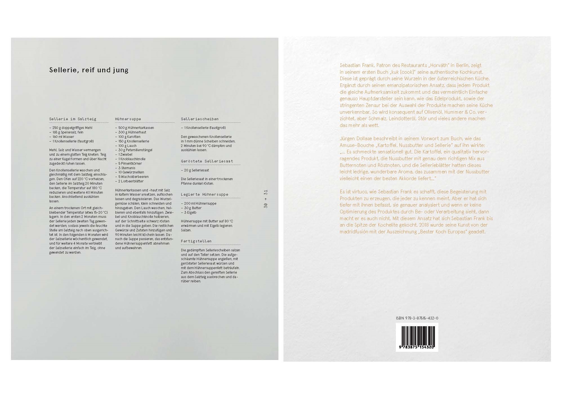 Sebastian Frank, Patron des Restaurants Horváth in Berlin, zeigt in seinem Kochbuch kuk [cook] seine authentische Kochkunst. Sein emanzipatorischer Ansatz, dass jedem Produkt die gleiche Aufmerksamkeit zukommt und das vermeintlich Einfache genauso Hauptdarsteller sein kann, wie das Edelprodukt, sowie die stringente Zensur bei der Auswahl der Produkte machen seine Küche unverkennbar. Es ist virtuos, wie Sebastian Frank es schafft, diese Begeisterung mit Produkten zu erzeugen, die jeder zu kennen meint. Aber er hat sich tiefer mit ihnen befasst, sie genauer analysiert und wenn er keine Optimierung des Produktes durch Be- oder Verarbeitung sieht, dann macht er es auch nicht. Mit diesem Ansatz hat sich Sebastian Frank bis an die Spitze der Kochelite gekocht. 2018 wurde seine Kunst von der madridfusión mit der Auszeichnung Bester Koch Europas geadelt.