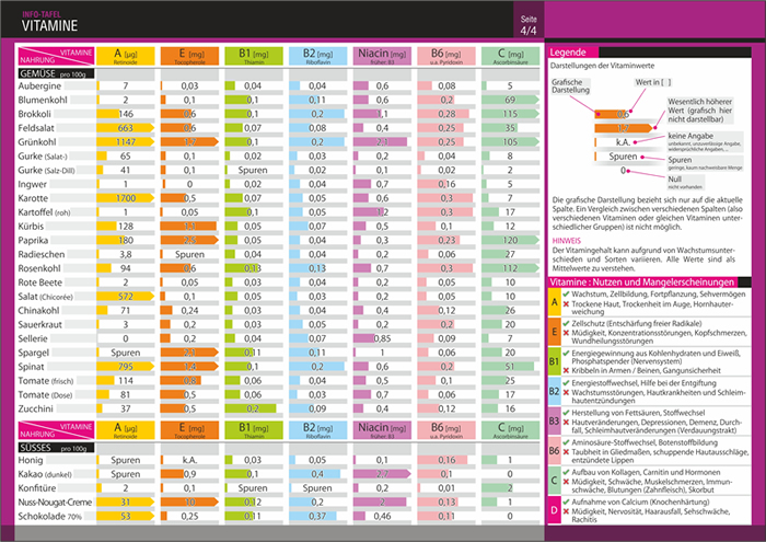 Zusätzlich enthalten sind Informationen zum Nutzen von Vitaminen sowie die jeweiligen Mangelerscheinungen.