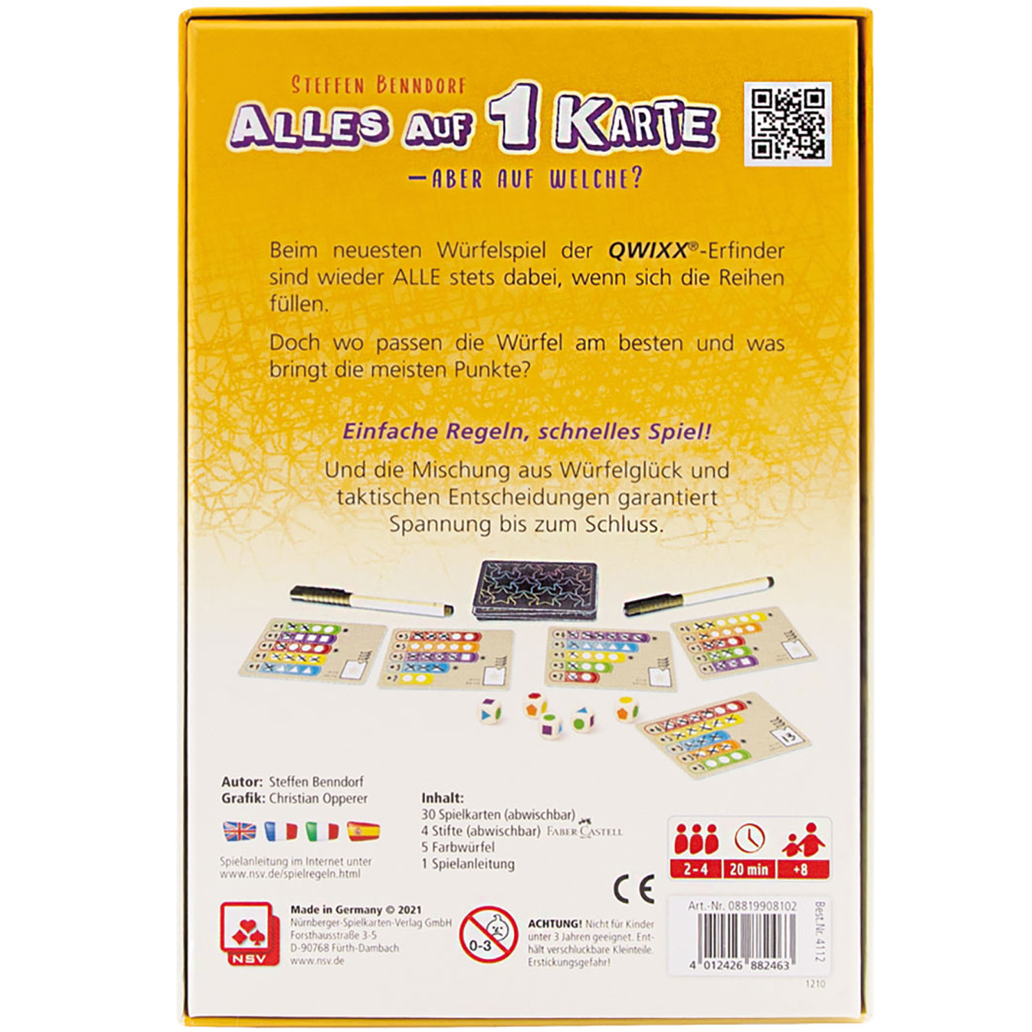 | Schlagworte | 2 Spieler • Abwischbar • Familie • Familienspiel • Farbwürfel • Gesellschaftsspiel • Made in Germany • Nürnberger Spielkarten Verlag GmbH • Roll & Write • schnelles spiel • Spieleabend • Würfelspiel |