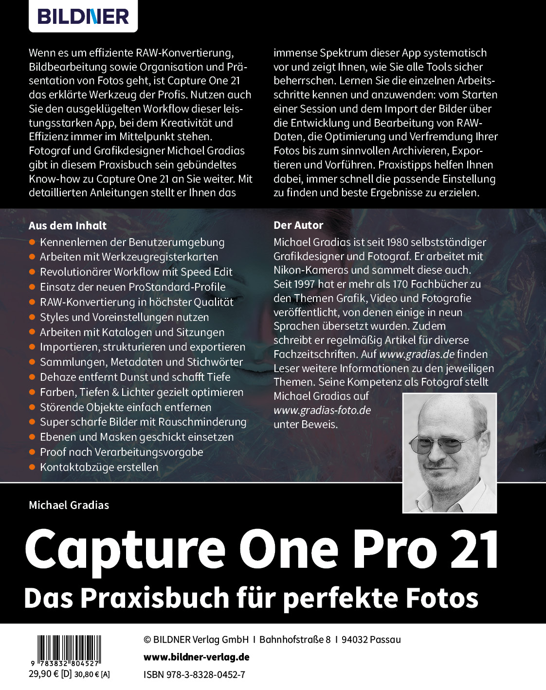 Fotograf und Grafikdesigner Michael Gradias gibt in diesem Praxisbuch sein gebündeltes Know-how zu Capture One 21 an Sie weiter. Mit detaillierten Anleitungen stellt er Ihnen das immense Spektrum dieser App systematisch vor und zeigt Ihnen, wie Sie alle Tools sicher beherrschen. Lernen Sie die einzelnen Arbeitsschritte kennen und anzuwenden: vom Starten einer Session und dem Import der Bilder über die Entwicklung und Bearbeitung von RAW-Daten, die Optimierung und Verfremdung Ihrer Fotos bis zum sinnvollen Archivieren, Exportieren und Vorführen. Praxistipps helfen Ihnen dabei, immer schnell die passende Einstellung zu finden und beste Ergebnisse zu erzielen.