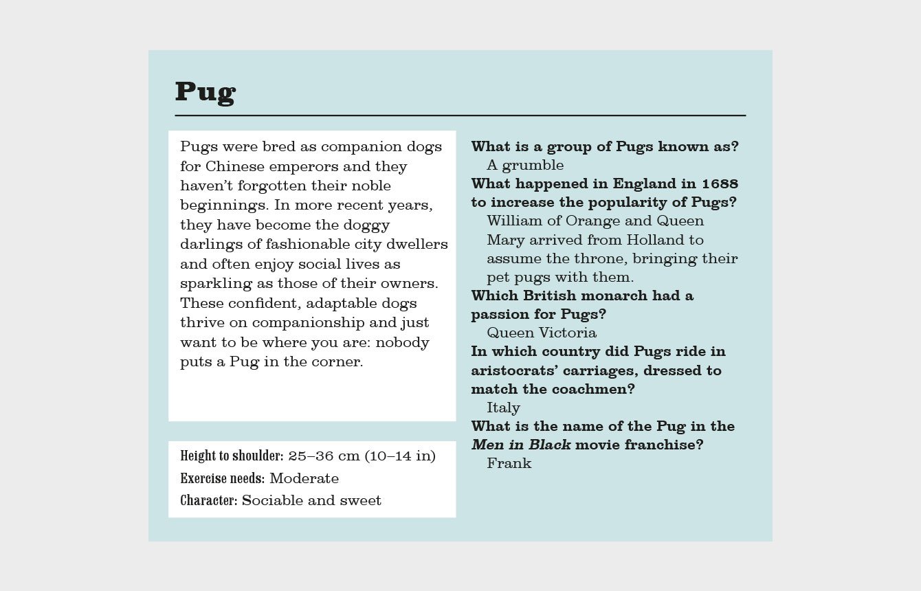 Fun and easy to play with all the family players will enjoy guessing dog breeds, then turning over the card to discover the answer and reveal extra trivia questions.
