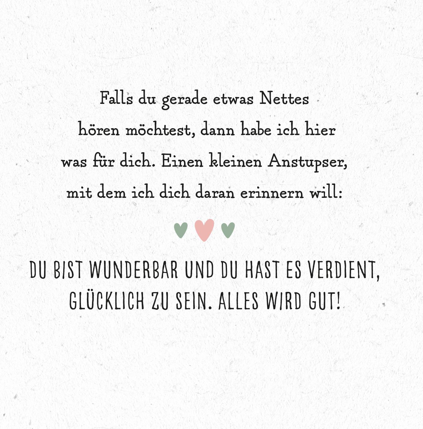 Falls du gerade etwas Nettes hören möchtest, dann habe ich hier etwas für dich. Einen kleinen Anstupser, mit dem ich dich daran erinnern will: Du bist wunderbar und du hast es verdient, glücklich zu sein. Dein kleines Büchlein zum Verschenken, Überraschen und immer wieder Lesen!