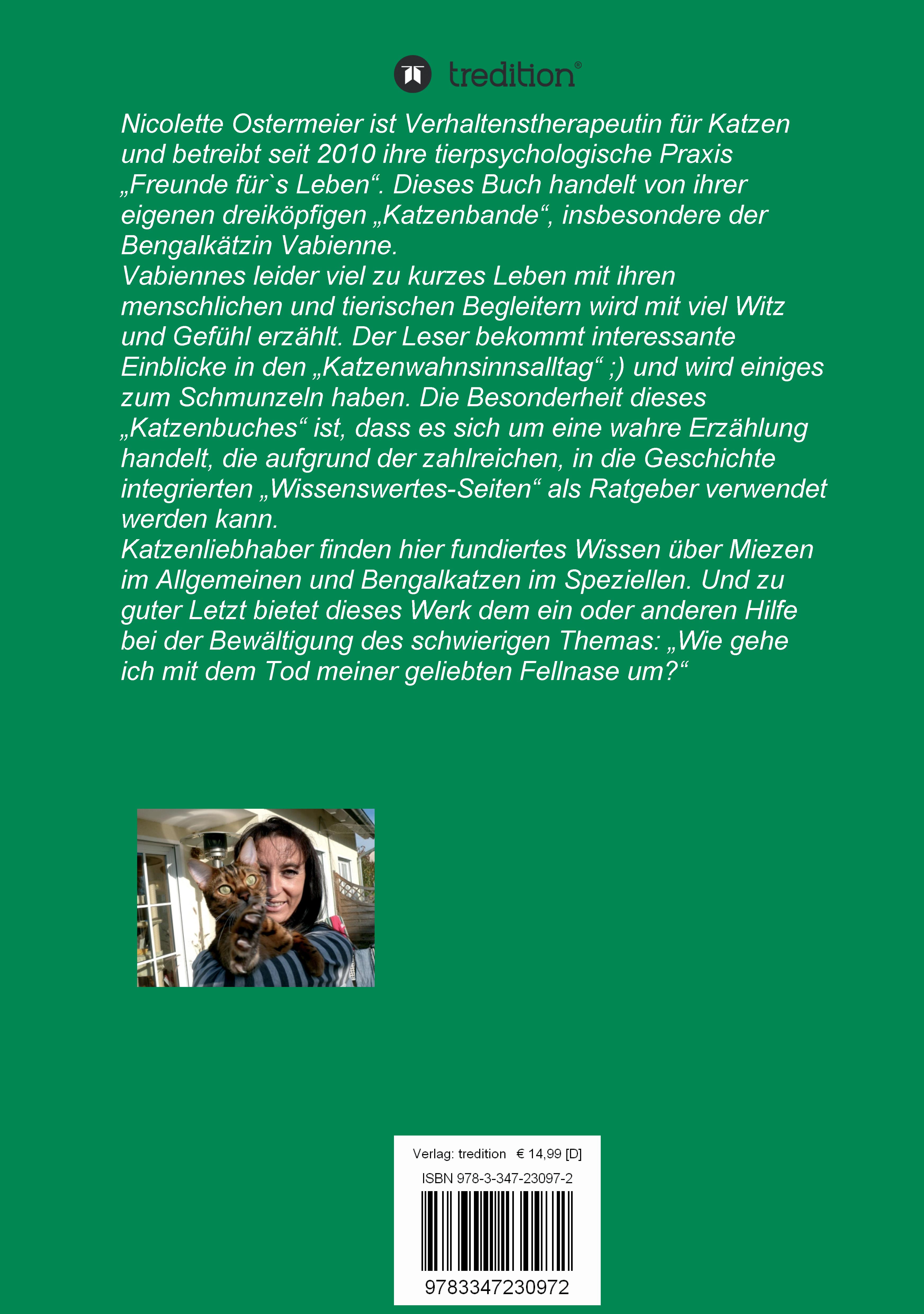 Nicolette Ostermeier, Jahrgang 1971, lebt mit ihrem Ehemann, einem Sohn, drei Stubentigern, sowie einer Bartagame in einem kleinen Ort in den Westlichen Wäldern, nahe Augsburg. Sie ist seit 1994 Polizeibeamtin in München und nutzte 2008 ihre Elternzeit um eine Ausbildung zur Tierpsychologin zu absolvieren. Nach erfolgreichem Abschluss 2010 konnte sie als zertifizierte Tierpsychologin ihre Praxis „Freunde für`s Leben“, Verhaltenstherapie und –beratung für Katzen gründen. (E-Mail: info@ffl-tierpsychologie.de Homepage: www.ffl-tierpsychologie.de) Seitdem begleitet sie hilfesuchende MiezenhalterIinnen und ihre Fellnasen um ihnen das Zusammenleben wieder zu erleichtern. Dazu zählt auch die 2013 initiierte Vortragsreiche „Glückliche Stubentiger“, die sie zusammen mit ihrer Freundin und tierpsychologischen Kollegin Claudia Bremer hält. Sie unterstützt durch ihre ehrenamtliche Tätigkeit das Augsburger Tierheim sowie die Tierhilfe ATTIS e.V. (Aktionsgemeinschaft der Tierversuchsgegner und Tierfreunde in Schwaben e.V.).