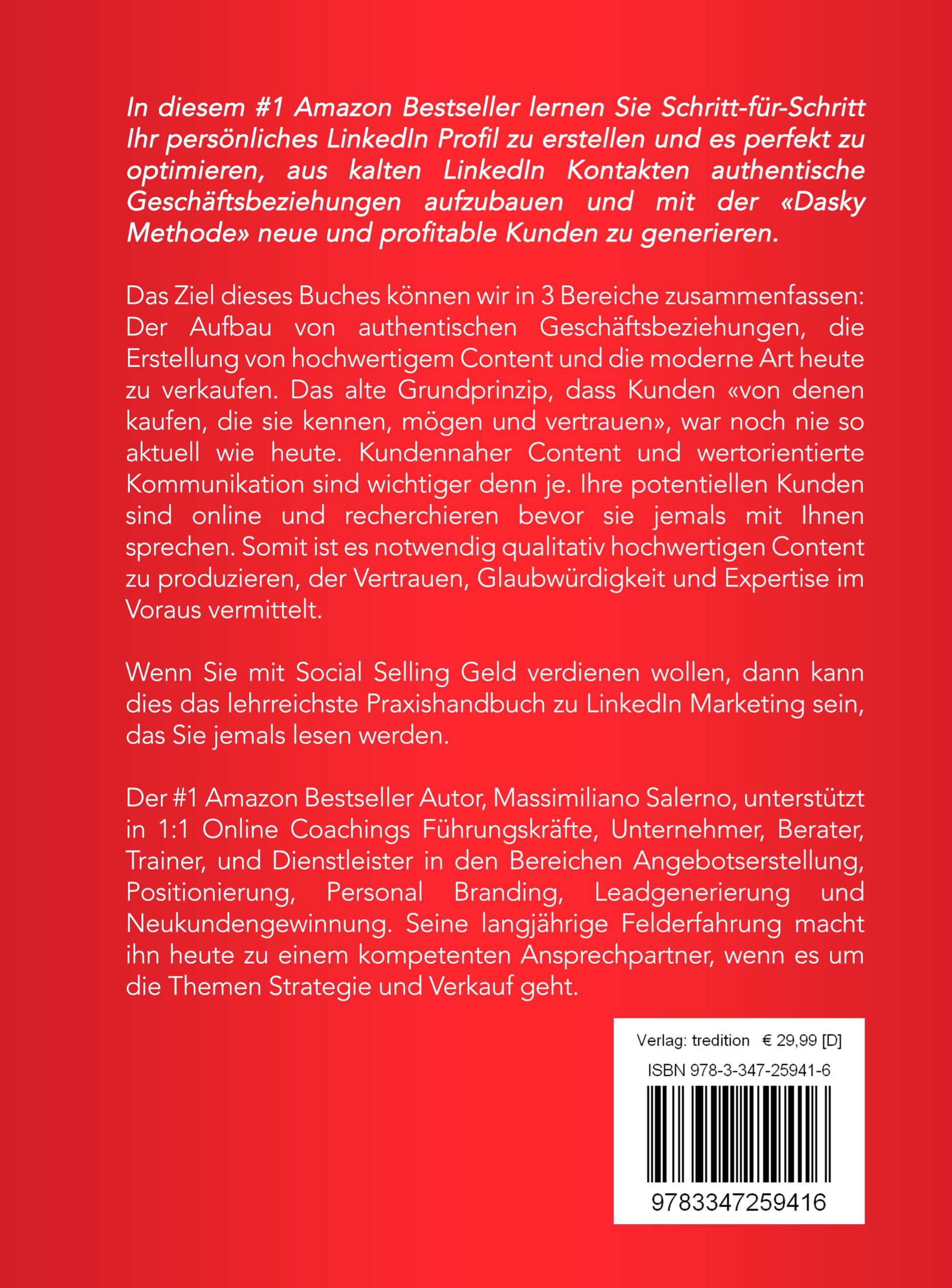 Best of LinkedIn Marketing und Social Business:Das Ziel des Buches können wir in 3 Bereiche zusammenfassen: Der Aufbau von authentischen Beziehungen, die Erstellung von hochwertigem Content und die moderne Art heute zu verkaufen. Diese Themen repräsentieren den Wandel vom «alten» zum «neuen Vertriebsmodell» und die daraus entstandene «digitale Transformation».Wenn Sie Social Business machen wollen, sich als Berater und Experte erfolgreich positionieren wollen, LinkedIn Kontakte in heisse Leads und in authentische Kundenbeziehungen von b2c und b2b Kunden umwandeln wollen, dann kann dies das lehrreichste Praxishandbuch zu LinkedIn Marketing & Social Selling sein, das Sie jemals lesen werden.Das alte Grundprinzip, dass Kunden «von denen kaufen, die sie kennen, mögen und vertrauen», war noch nie so aktuell wie heute. Kundennaher Content und Kommunikation in der «Sprache des Kunden» sind wichtiger denn je. Ihre potentiellen Kunden sind online und recherchieren bevor sie jemals mit Ihnen sprechen. Deshalb ist es notwendig, qualitativ hochwertigen Content zu produzieren, der Ihren idealen Kunden Wissen und Expertise im Voraus vermittelt.Ihr Verkaufsprozess muss heute von «Was kann ich Ihnen verkaufen?» auf «Wie kann ich Ihnen helfen?» umgestellt werden. Das bedeutet, um neue Kunden zu gewinnen und zu verstehen wie man sie online am besten bedient und ihren Bedürfnissen entspricht, müssen Sie Zeit und Energie in Personal Branding, Content, Social Media Marketing und Social Selling investieren.Ich bin zuversichtlich, dass wenn Sie das umsetzen, was Sie in diesem Social Media und LinkedIn Marketing Ratgeber lernen, einen erheblichen ROI-Unterschied in Ihren Marketing- und Verkaufsaktivitäten feststellen werden. Und mit «ROI» meine ich sowohl den «Return on Investment» als auch den «Return on Impact» in den Beziehungen von Mensch zu Mensch.Sind Sie bereit?Gut! Dann lassen Sie uns loslegen!Beste Grüsse und bleiben Sie gesund!Massimiliano Salerno