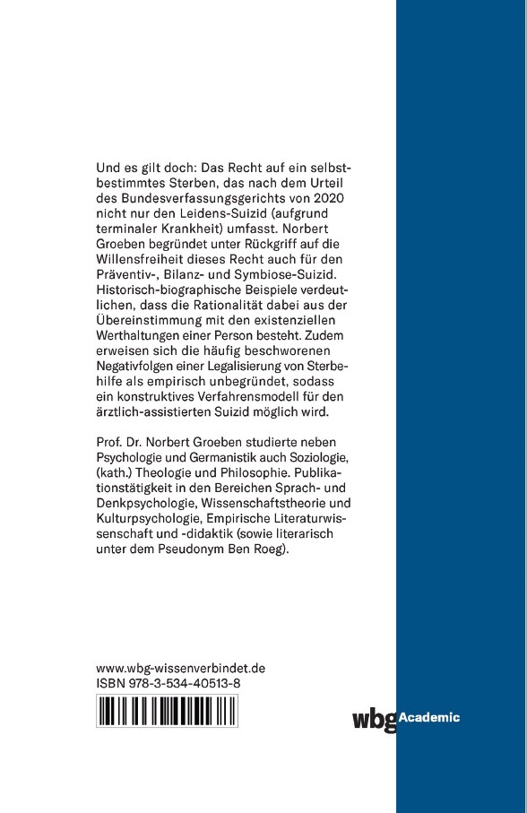 | Schlagworte | Aufklärung • Bilanz-Suizid • Bundesverfassungsgericht • Dammbruch-These • Leidens-Suizid • Missbrauch • Präventiv-Suizid • Schiefe-Ebene-Argumentation • Selbstbestimmtes Sterben • Selbstmord • Sterbebeistand • Sterbehilfe • Sterben • Suizid • Symbiose-Suizid • wbg Publishing Services • Willensfreiheit |