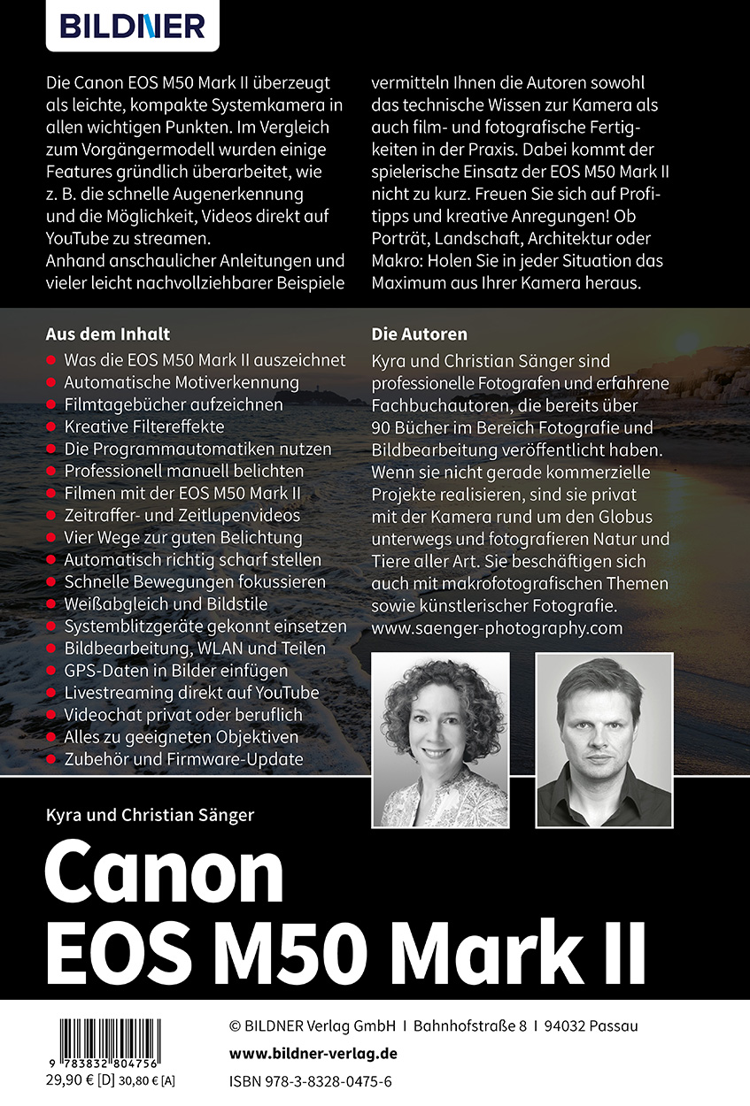 Anhand anschaulicher Anleitungen und vieler leicht nachvollziehbarer Beispiele vermitteln Ihnen die Autoren sowohl das technische Wissen zur Kamera als auch film- und fotografische Fertigkeiten in der Praxis. Dabei kommt der spielerische Einsatz der EOS M50 Mark II nicht zu kurz. Freuen Sie sich auf Profitipps und kreative Anregungen! Ob Porträt, Landschaft, Architektur oder Makro: Holen Sie in jeder Situation das Maximum aus Ihrer Kamera heraus.