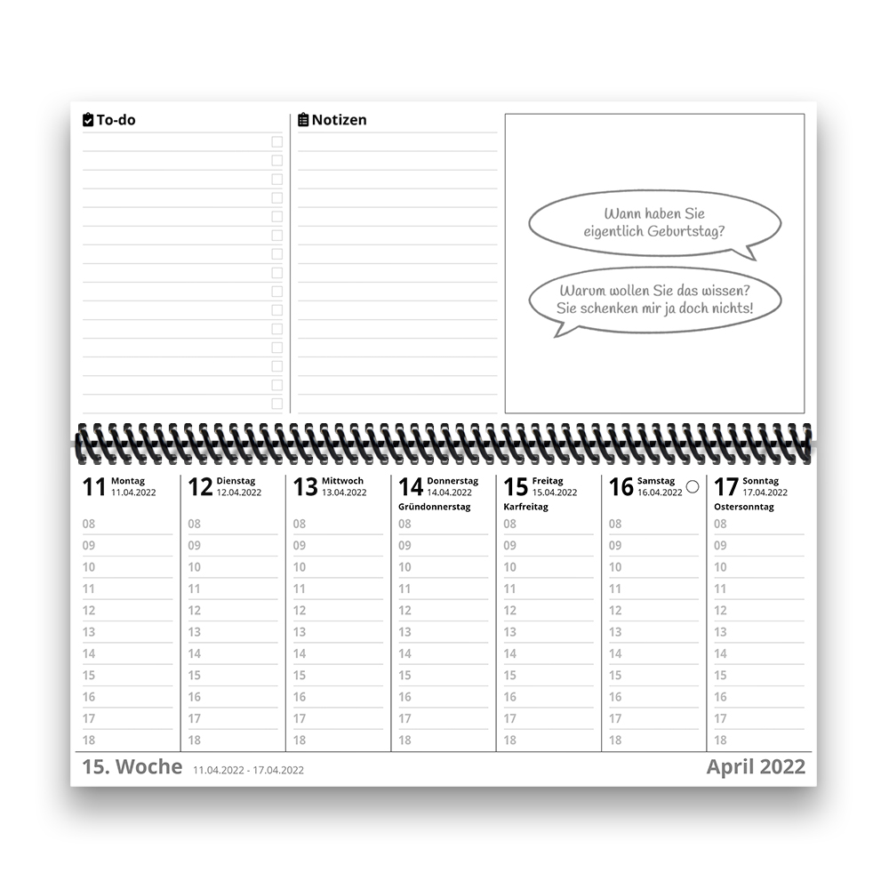 | Schlagworte | 14 Monate • 1 woche 2 seiten • 2022 • 60 Wochen • 7-Tage-Woche • Arbeitszimmer • Beschäftigung • Büro • Comedy • extra groß • Interkulturelle Feiertage • Jahresübersicht • Kalender • Kindergarten • lustig • Notizen • Organiser • Planer • quer-format • Querkalender • Schreibtisch • Schreibtischkalender • Schule • Schulferien • Sketch • Spaß • Spiralbindung • Stundenaufteilung • Terminplaner • Tischkalender • Tischkalender 2022 • to do • Wandkalender • Witze • XL-Kalender |