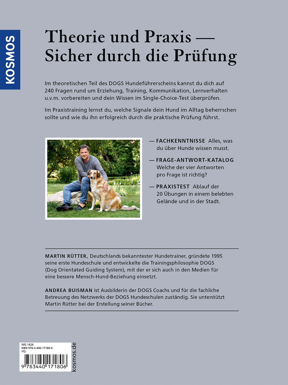 In Martin Rütters Netzwerk DOGS gibt es ein neues Angebot: den DOGS Hundeführerschein. 240 Fragen rund um Erziehung, Training, Kommunikation, Lernverhalten u.v.m. wurden auf neuesten wissenschaftlichen Erkenntnissen in einem Frage-Antwort-Katalog entwickelt und werden in einer theoretischen Prüfung abgefragt. Im praktischen Teil werden unter Anleitung von Coachs aus dem DOGS Netzwerk Grundsignale und Alltagssituationen geübt. Dieses Buch vermittelt alle Kursinhalte und unterstützt bestens bei der Vorbereitung auf die Prüfung.