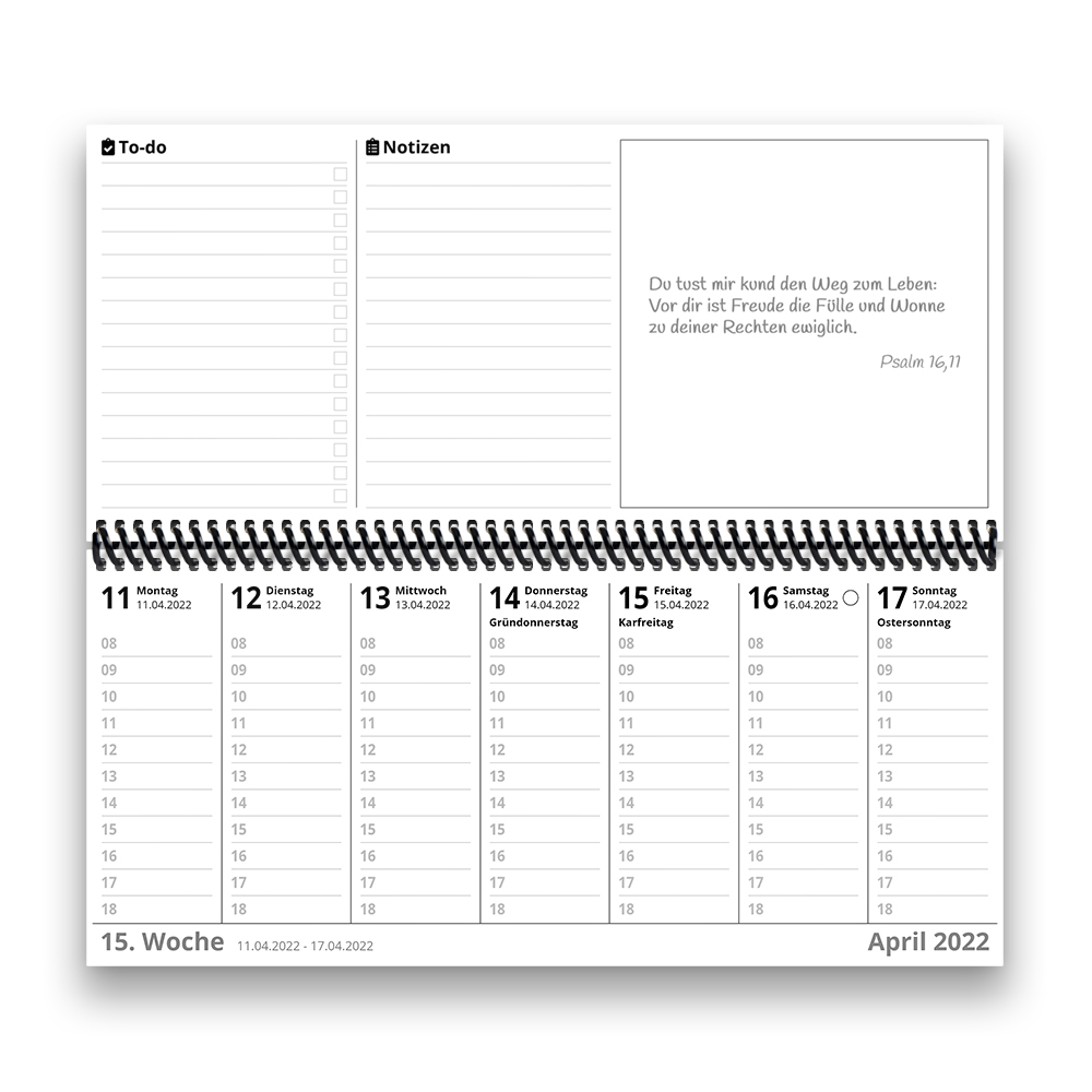 | Schlagworte | 14 Monate • 1 woche 2 seiten • 2022 • 60 Wochen • 7-Tage-Woche • Altes Testament • Apostel • Arbeitszimmer • Beschäftigung • Beten • Bibel • Bibeltext • Büro • Christen • Evangelien • Evangelisch • extra groß • Gebet • Glauben • Gott • Heilige Schrift • Interkulturelle Feiertage • Jahresübersicht • Jesus • Kalender • Katholisch • Kindergarten • Kirche • Lebenshilfe • Neues Testament • Notizen • Organiser • Planer • Psalm • quer-format • Querkalender • Religion • Schreibtisch • Schreibtischkalender • Schule • Schulferien • Spiralbindung • Stundenaufteilung • Terminplaner • Tischkalender • Tischkalender 2022 • to do • Verse • Wandkalender • XL-Kalender |