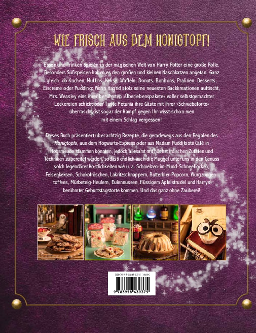 Backe, backe Kuchen, Hogwarts hat gerufen! Lakritz-Zauberstäbe, Zischende Wissbies, Sirupbonbons und Kesselkuchen: in der Welt von Harry Potter und seinen Freunden geht es neben allerhand Abenteuern und Magie auch um eins - ums Naschen! Die Tische in der großen Halle biegen sich regelmäßig unter süßen Leckereien aus der Küche, in Fred und George Weasleys Scherzartikelladen "Zauberhafte Zauberscherze" gibt es Süßigkeiten mit unterhaltsamen Nebeneffekten und beim Gedanken an die zuckrigen Köstlichkeiten im Honigtopf kriegt garantiert jeder Zahnarzt einen Schweißausbruch. Mit seinem Harry-Potter-Kochbuch hat Tom Grimm bereits ein fantastisches Meisterwerk voll magischer Köstlichkeiten gezaubert - jetzt legt er mit diesem brandneuen Back- und Süßigkeitenbuch nach! Liebevoll, detailreich und aufwändig gestaltet, lädt dieses Backbuch ein zum Schmökern und Schwelgen. Alle Rezepte sind schön dekoriert und in Szene gesetzt, mit Zubehör und Gegenständen aus der Harry Potter Zauber-Welt. Also - Harry Potter-Backtag (mit Kindern oder Freunden) einlegen und losbacken: Mürbeteig-Heuler, Mandragoras, Goldene Schnatze oder Schoko-Acromantulas backen und dazu ein Glass Butterbier oder Wolfsbanntrank genießen! Oder wie wäre es mit einem Harry Potter-Adventsbacken: Butterbier-Shortbread, Ingwerkekse, Prof. Slughorns Popcornbällchen und Weihnachtskuchen bringen Abwechslung in die Weihnachtsbäckerei, dazu ein Becher Dumbledores Lieblingstee, Amortentia (Gin mit Grenadine) oder Felxi Felicis (Honiglikör) - der Adventssonntag ist gerettet!Nicht nur Potterheads werden an den zauberhaften Rezepten Freude haben, die sich auch ideal für Halloween, Weihnachten und natürlich für Harry-Potter-Geburtstagsfeiern anbieten. Ein tolles Buch für Harry Potter-Fans und zum Verschenken!