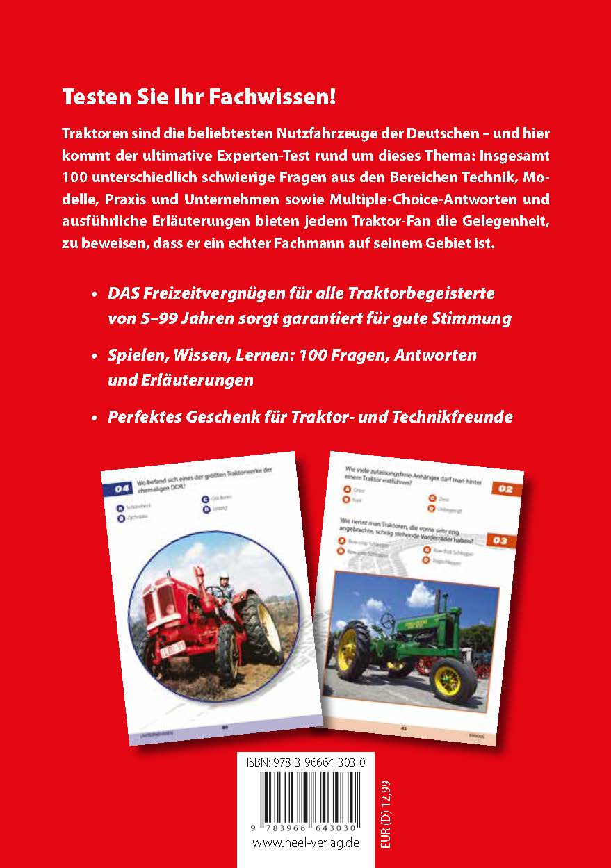 Testen Sie Ihr Fachwissen!Traktoren sind die beliebtesten Nutzfahrzeuge der Deutschen - und hier kommt der ultimative Experten-Test rund um dieses Thema: Insgesamt 100 unterschiedlich schwierige Fragen aus den Bereichen Technik, Modelle, Praxis und Unternehmen sowie Multiple-Choice-Antworten undausführliche Erläuterungen bieten jedem Traktor-Fan die Gelegenheit, zu beweisen, dass er ein echter Fachmann auf seinem Gebiet ist. - DAS Freizeitvergnügen für alle Traktorbegeisterte von 5-99 Jahren sorgt garantiert für gute Stimmung. Spielen, Wissen, Lernen - dies ist das perfekte Geschenk für große und kleine Traktor- und Technikfreunde! Ganz besonders die zahlreichen Aufnahmen historischer Traktoren werden Nutzfahrzeug-Fans große Freude bereiten!