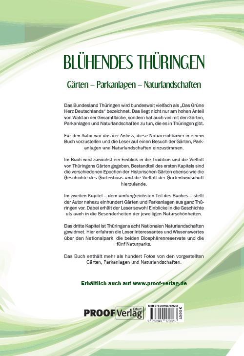 Thüringen wird nicht umsonst das „Land der vielen Burgen und Schlösser“ oder auch „Das grüne Herz Deutschlands“ genannt. Diesem Thema hat sich Walter Kehr in seinem neuen Buch ausführlich gewidmet. Er nimmt die Leser auf eine blühende Rundreise durch ganz Thüringen mit. Im Buch wird zunächst ein Einblick in die Tradition und die Vielfalt von Thüringens Gärten gegeben. Bestandteil des ersten Kapitels sind die verschiedenen Epochen der Historischen Gärten ebenso wie die Geschichte des Gartenbaus und die Vielfalt der Gartenlandschaft hierzulande. Im zweiten Kapitel - dem umfangreichsten Teil des Buches - stellt der Autor nahezu einhundert Gärten und Parkanlagen aus ganz Thüringen vor. Dabei erhält der Leser sowohl Einblicke in die Geschichte als auch in die Besonderheiten der jeweiligen Naturschönheiten. Das dritte Kapitel ist Thüringens acht Nationalen Naturlandschaften gewidmet. Hier erfahren die Leser Interessantes und Wissenswertes über den Nationalpark, die beiden Biosphärenreservate und die fünf Naturparks.