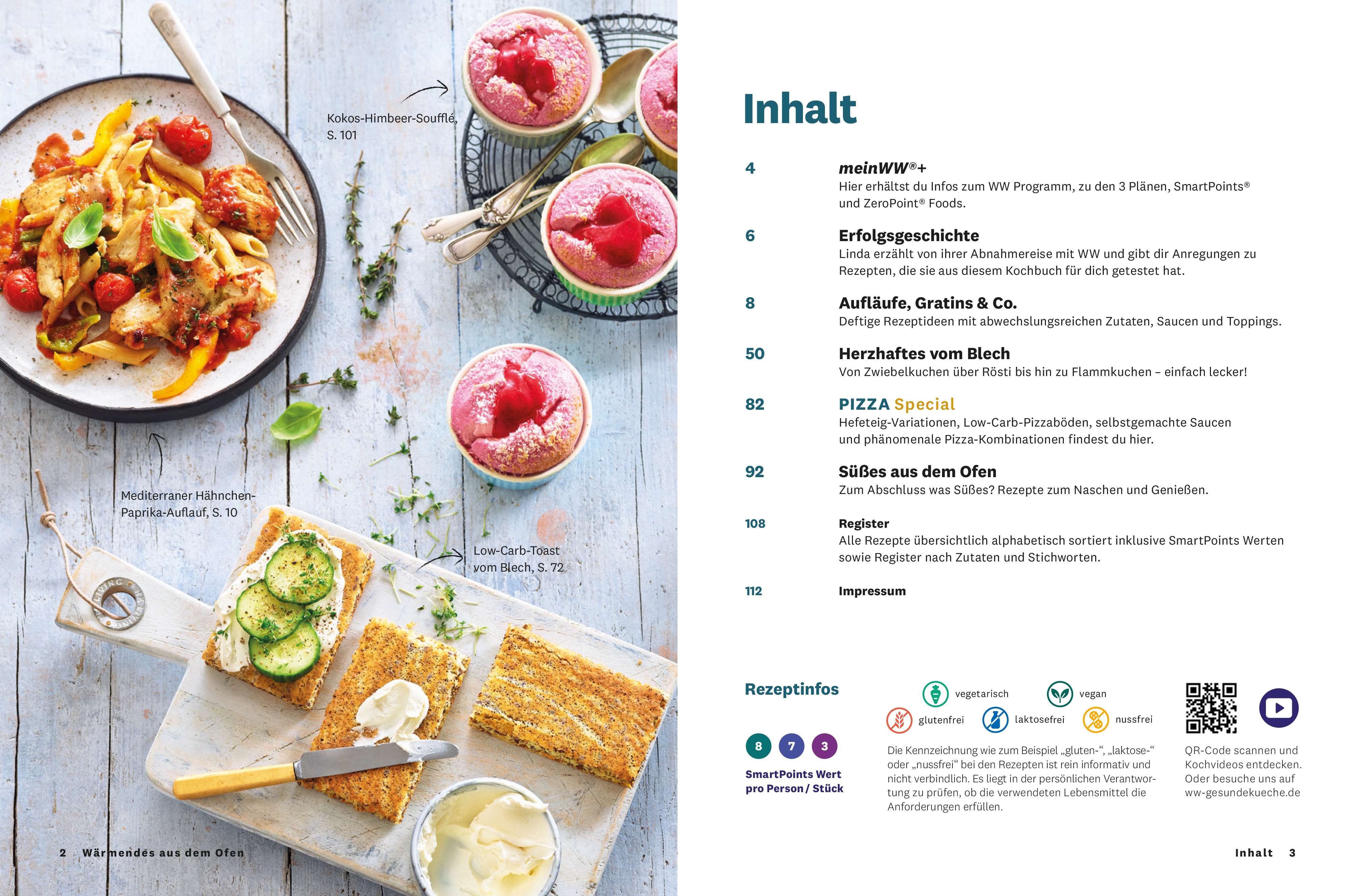 Aufläufe, Gratins und Quiches teilen sich das erste Kapitel des innovativen Kochbuchs. WW inspiriert zu neuen Kochideen und ersetzt beispielsweise herkömmliche Krusten, die Ofengerichte ungesund machen können, kurzerhand durch alternative Toppings, wie Cashews oder Tofucrumble.