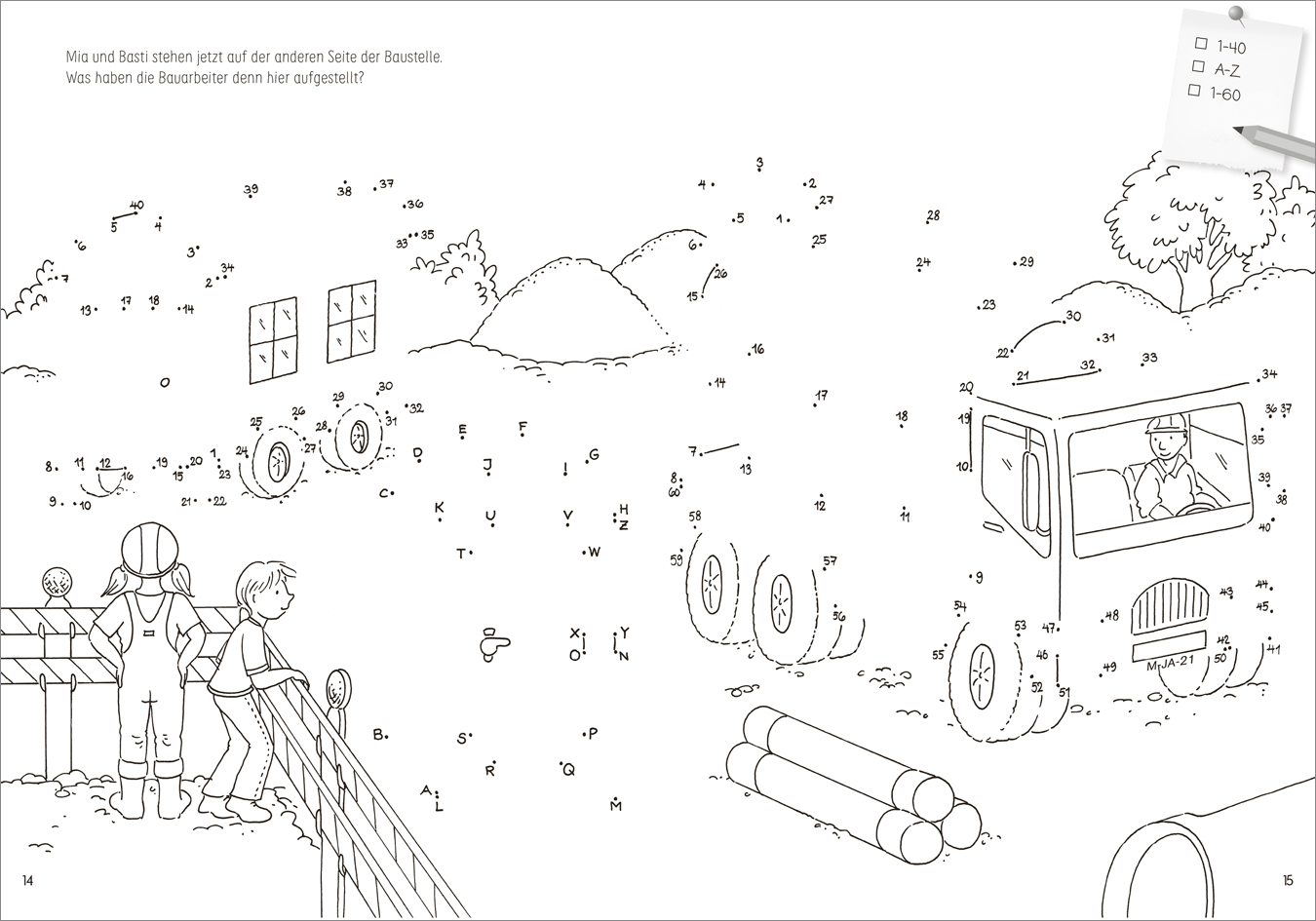 Kipplaster, Löffelbagger und Erdbohrer sind nur einige der vielen tollen Motive, die Kinder in diesem Malbuch von Punkt zu Punkt von 1 bis 100 sowie von A bis Z verbinden können. Das Nachzeichnen und Ausmalen der großen und kleinen Baustellenfahrzeuge macht nicht nur Spaß, sondern fördert auch Konzentration und Motorik. Für kurzweilige Unterhaltung sorgt die kleine Geschichte über die Kinder Mia und Basti, die das muntere Treiben auf der Baustelle vom Abriss der Ruine über den Rohbau bis hin zum fertigen Gebäude verfolgen. Der Lösungsteil am Ende des Heftes verrät, ob Abrissbirne, Planierraupe, Kranwagen und Co. die richtige Form erhalten haben. Für alle, die Malen lieben und von Baustellen fasziniert sind!