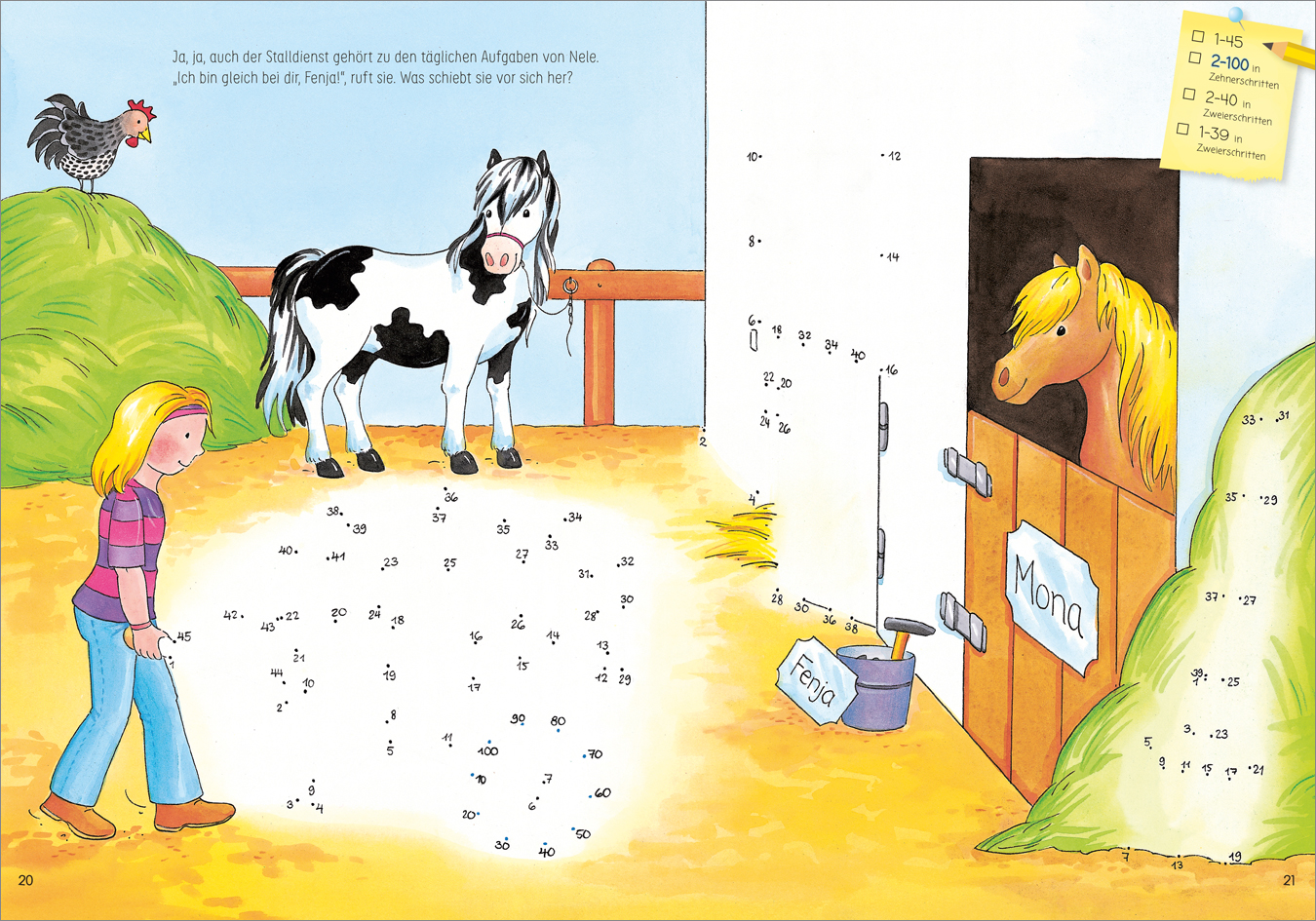 Dressurreiten, Stalldienst, Voltigierstunde - auf dem Ponyhof ist jeden Tag was los. Um die schönen Szenen vollständig sichtbar zu machen, müssen die Kinder die Punkte von 1 bis 100 und von A bis Z einfach miteinander verbinden. Damit während des Malens keine Langeweile aufkommt, findet sich passend zu den teils farbigen Szenerien eine liebevoll erzählte Geschichte über Nele und ihr Pony Fenja. Ob die Motive von Ponys und Pferden, Kutschen und Zubehör, Kunststücken und Springübungen richtig verbunden sind, lässt sich im Lösungsteil am Ende des Heftes überprüfen. Für Mal- und Pferdefreunde ab 7 Jahren.