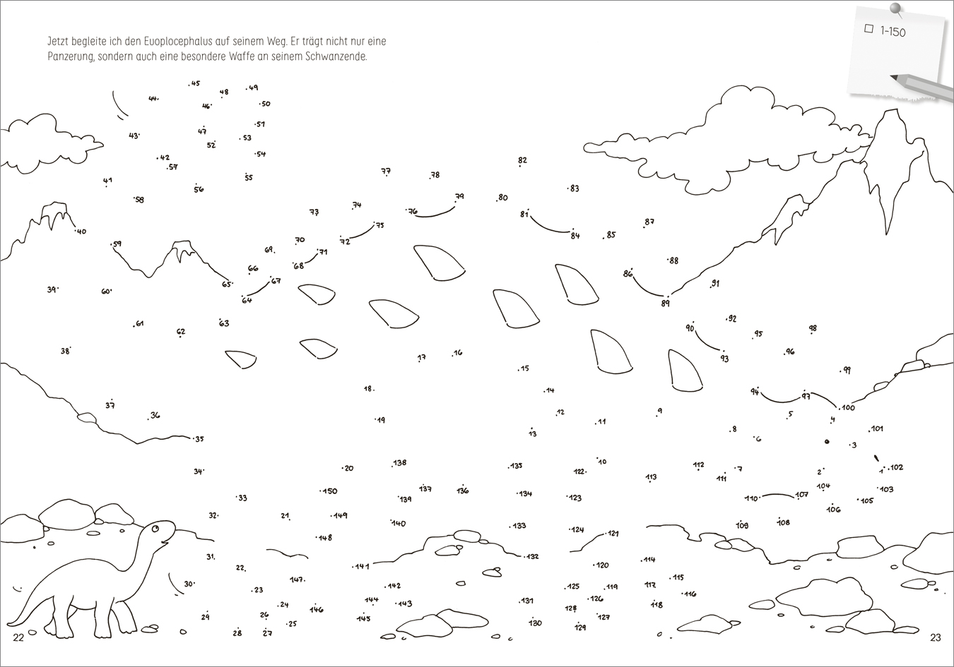 Der kleine Dinosaurier Dini führt Kinder ab 7 Jahren bei einem Spaziergang durch seine Welt. Dabei trifft er auf den teils farbig illustrierten Seiten auf Freunde wie den Brontosaurus und den Stegosaurus, aber auch auf Dinosaurier, vor denen man sich besser in Acht nehmen sollte. Und das Besondere daran: Die Kinder können die verschiedenen Dinosaurier durch das Verbinden der Punkte von 1 bis 150 selbst erschaffen. Ob die Umrisse der Urzeitriesen richtig sind, verrät der Lösungsteil am Ende des Heftes. Anschließend können die Dinosaurierfans ihre Lieblingstiere noch in bunten Farben ausmalen.