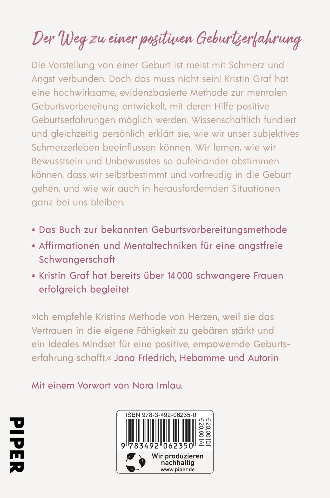 Die Vorstellung von einer Geburt ist meist mit Schmerz und Angst verbunden. Doch das muss nicht sein! Kristin Graf hat eine hochwirksame, evidenzbasierte Methode zur mentalen Geburtsvorbereitung entwickelt, mit deren Hilfe positive Geburtserfahrungen möglich werden. Wissenschaftlich fundiert und gleichzeitig persönlich erklärt sie, wie wir unser subjektives Schmerzerleben beeinflussen können. Wir lernen, wie wir Bewusstsein und Unbewusstes so aufeinander abstimmen können, dass wir selbstbestimmt und vorfreudig in die Geburt gehen und wie wir auch in herausfordernden Situationen ganz bei uns bleiben.