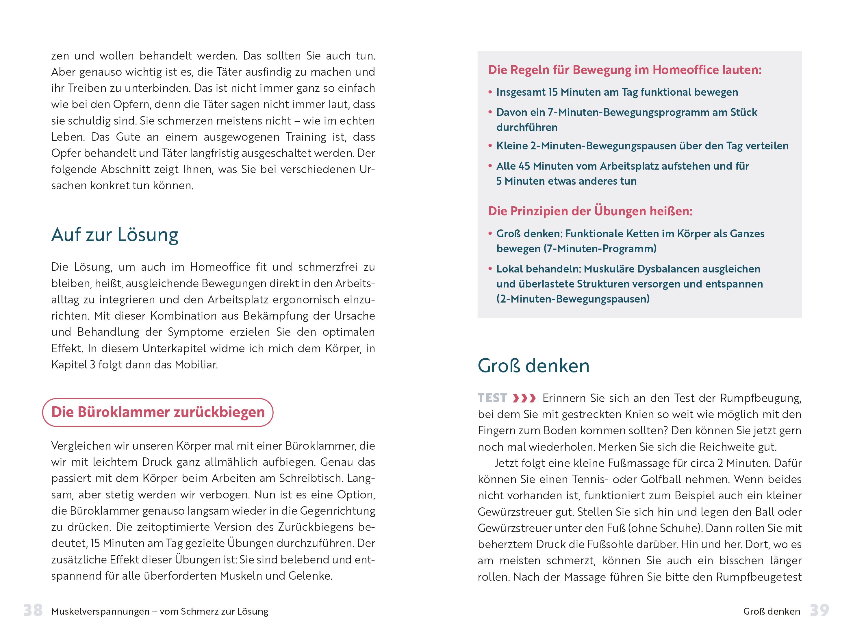 Mit Selbsttest zur Status-Quo-Ermittlung, leichten 7-Minuten-Programmen sowie über 40 Sofortübungen, die sich problemlos in den Arbeitsalltag integrieren lassen, und einem konkreten Behandlungsprogramm für Faszien und Triggerpunkte gegen akute Schmerzen. So kann auch von zu Hause effizient und entspannt gearbeitet werden.