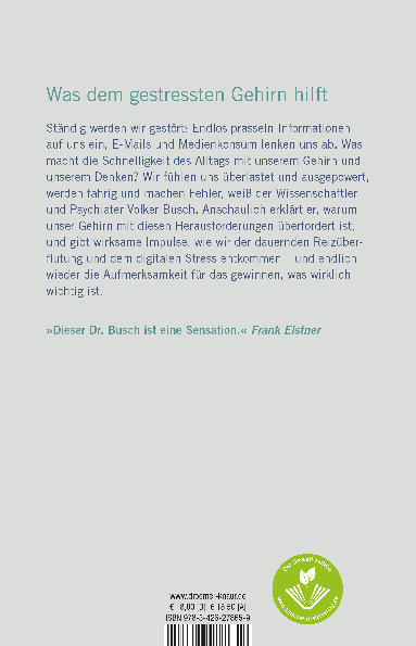In unserem stressigen Alltag lauern viele Ablenkungen: Ständig meldet sich der E-Mail-Account, ständig drohen Deadlines, ständig prasseln Informationen auf uns ein, und am besten sollen wir alles gleichzeitig und sofort erledigen. Was macht das mit uns und unserer Fähigkeit, konzentriert und kreativ zu sein? Wir fühlen uns überlastet und ausgepowert, werden fahrig und machen Fehler, weiß der Neurowissenschaftler und Psychiater Volker Busch. Anschaulich erklärt er, warum unser Gehirn mit den Ablenkungen des digitalen Alltags überfordert ist, und weiß, wie wir wirksam gegen die dauernde Reizüberflutung und die Macht der Aufmerksamkeits-Diebe vorgehen können: indem wir uns wann immer möglich eine "tiefe Stunde" gönnen – Zeit, die jeder von uns nutzen kann, um dem Würgegriff der Ablenkungen zu entkommen, Aufmerksamkeit, Konzentration und Kreativität zu tanken und wieder leistungsfähig zu werden.