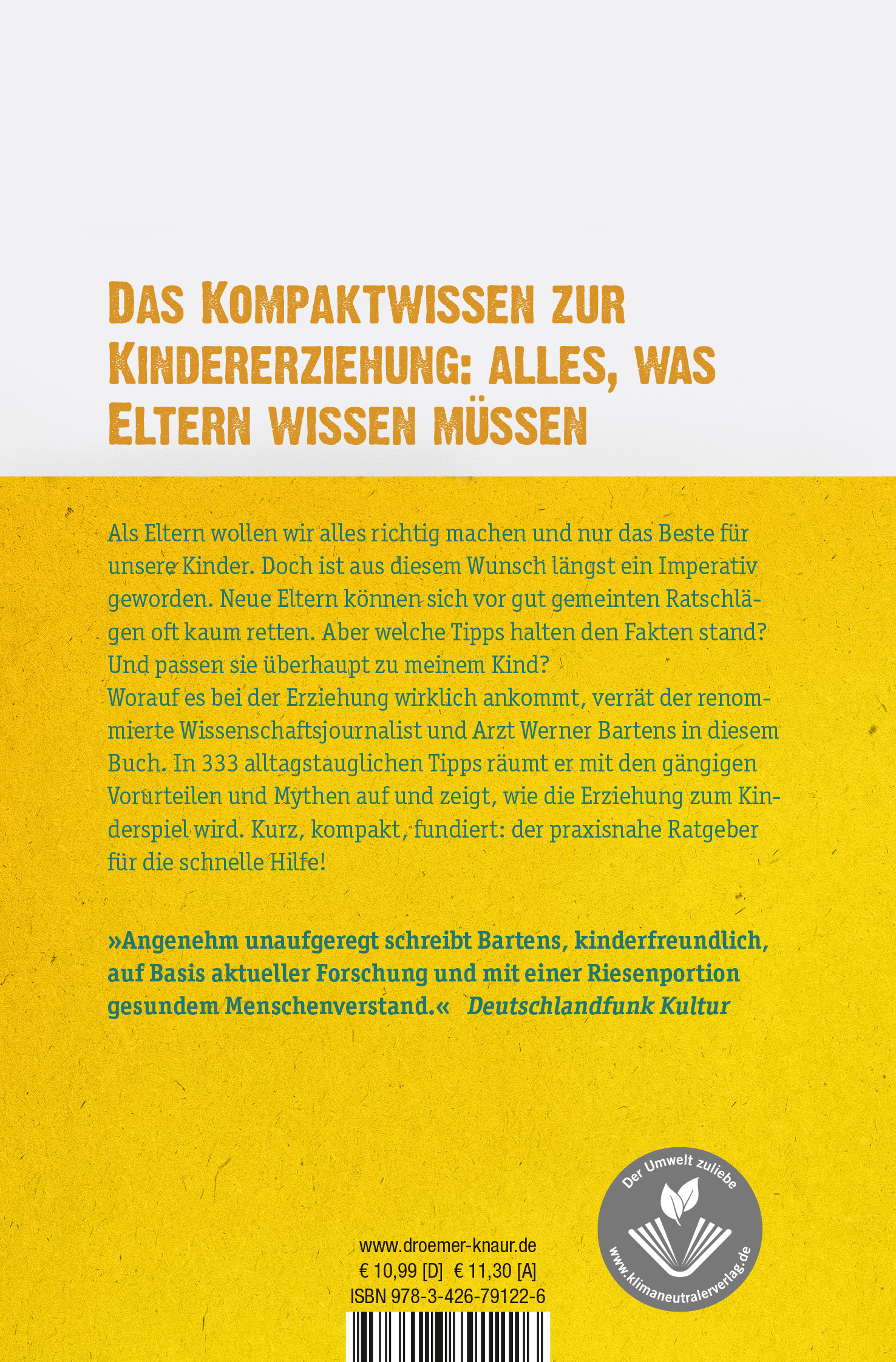 Der renommierte Wissenschaftsjournalist und Arzt Werner Bartens ist selbst fünffacher Vater und kennt die Fragen und Unsicherheiten, von denen sich Eltern nur allzu leicht unter Druck setzen lassen. In seinem Buch versammelt der Spiegel-Bestseller-Autor 333 prägnante, wissenschaftlich fundierte und alltagstaugliche Tipps, wie die Erziehung zum Kinderspiel wird. Kurz, kompakt und gut verständlich räumt er mit den gängigen Vorurteilen und Erziehungsmythen auf und zeigt, wie man das eigene Kind zu einem glücklichen, gesunden und selbständigen Menschen erzieht.