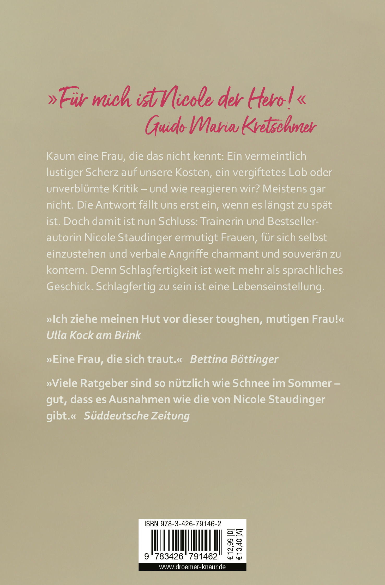lt;p>Trainerin und Bestseller-Autorin Nicole Staudinger befreit Frauen aus der ungewollten Sprachlosigkeit: mit praktischen Tipps zum schlagfertigen Kontern stärkt sie das Selbstbewusstsein von Frauen. Die erweiterte Neuausgabe des beliebten Bestsellers!