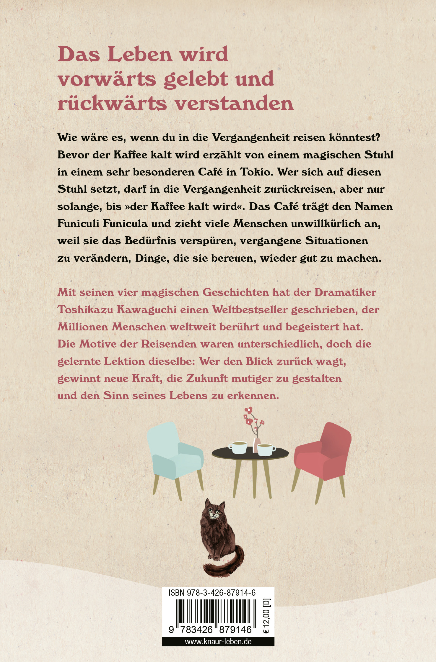 Im Stil von Das Café am Rande der Welt erzählt der Dramatiker Toshikazu Kawaguchi vier mitreißende Geschichten von Menschen, die in die Vergangenheit gereist sind. Ihre Motive waren unterschiedlich, doch die gelernte Lektion dieselbe. Egal ob Versöhnung, Vergebung oder neue Hoffnung - das Leben wird vorwärts gelebt und rückwärts verstanden.
