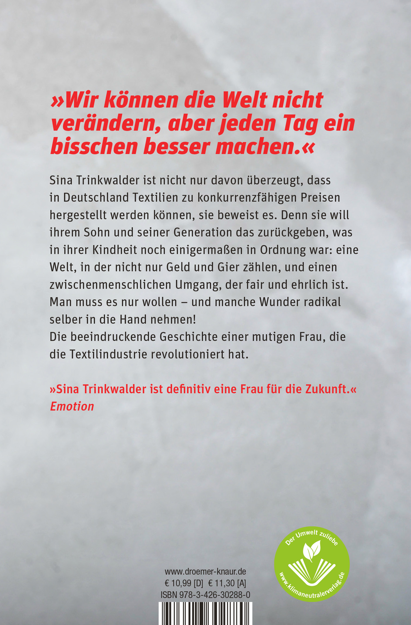 | Schlagworte | Arbeit • Arbeitslosigkeit • Arbeitslosigkeit senken • Arbeitsplätze • Arbeitsstellen schaffen • Augsburg • Autobiografien Frauen • Biografie Wirtschaft • Deutschland Politik Kultur Gesellschaft • Erfahrungen und wahre Geschichten • Erfahrungsberichte • FAIR • Gesellschaftskritik • Gesellschaftskritische Bücher • gutes Gewissen • Jeans • Jobs schaffen • Jobsuche • Klamotten • Lebensgeschichten Frauen • Manomama • Menschen helfen • Mut • Mutmachbuch • Mut mach Buch • Mut machen • nachhaltig • nachhaltig arbeiten • Nachhaltigkeit • nachhaltigkeit leben • nachhaltig leben • Nähen • Neustart • Ökologie • RTL • Sachbuch Gesellschaft • Sauber • Sina Trinkwalder • Sozial • sozialkritische Bücher • Textilbranche • Textilien • Textilwirtschaft • Trinkwalder • TV • unternehmer buch • Unternehmerin • Veränderung • wahre geschichten bücher • Weltverbeserung • Welt verbessern • Wirtschaft Buch • Wirtschaft und Gesellschaft • Ziele erreichen |
