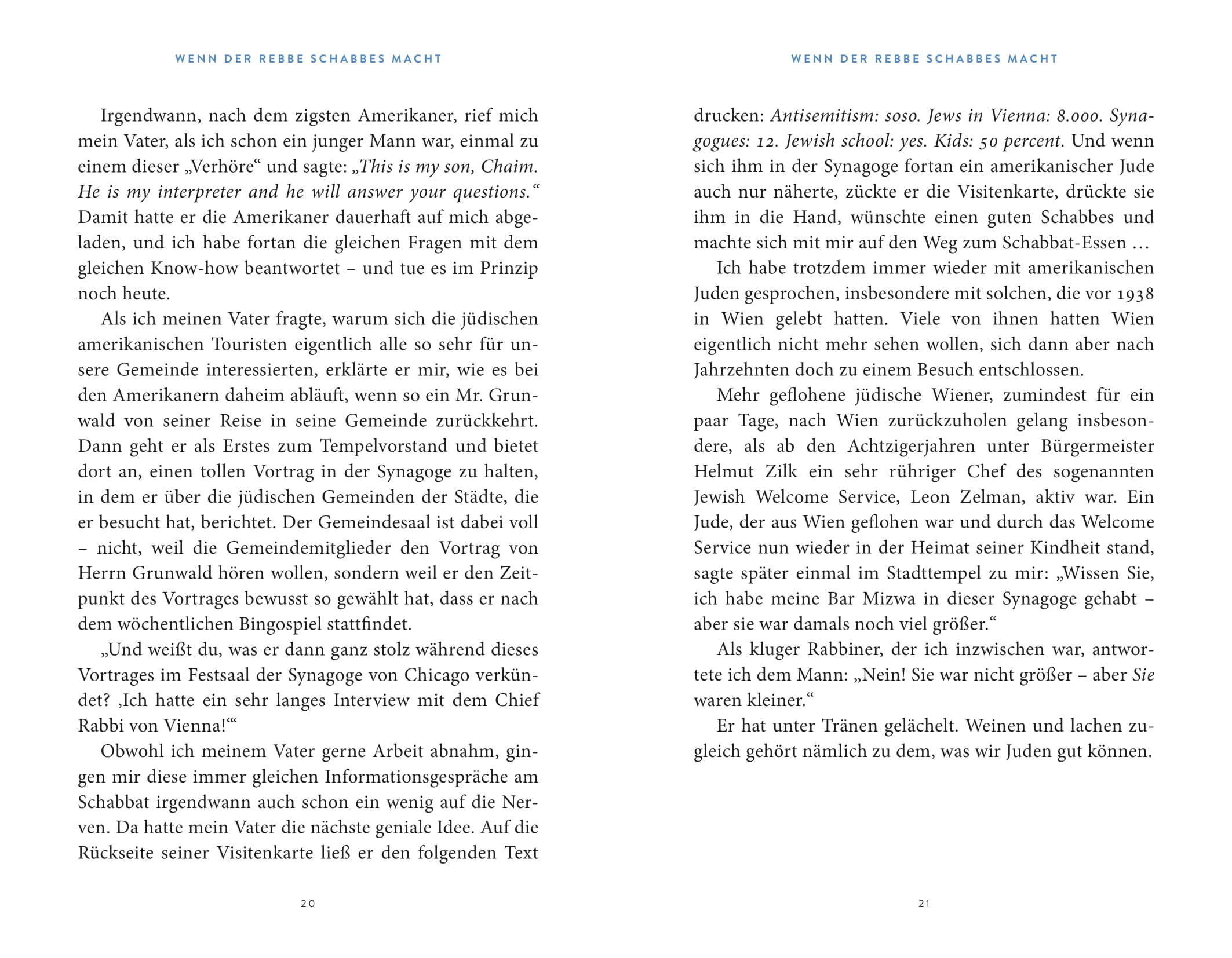 Paul Chaim Eisenberg erinnert sich an interessante Begegnungen und Ereignisse, an Krisen und Höhepunkte, lässt an der Geschichte seiner Familie, die ursprünglich aus Ungarn stammt, teilhaben und würzt seine Erfahrungen gekonnt mit jüdischer Weisheit und jüdischem Humor. Und so wird "ganz nebenbei" in diesen kurzweilig geschriebenen Memoiren auch Wissen zu jüdischer Tradition und Lebensweise vermittelt.